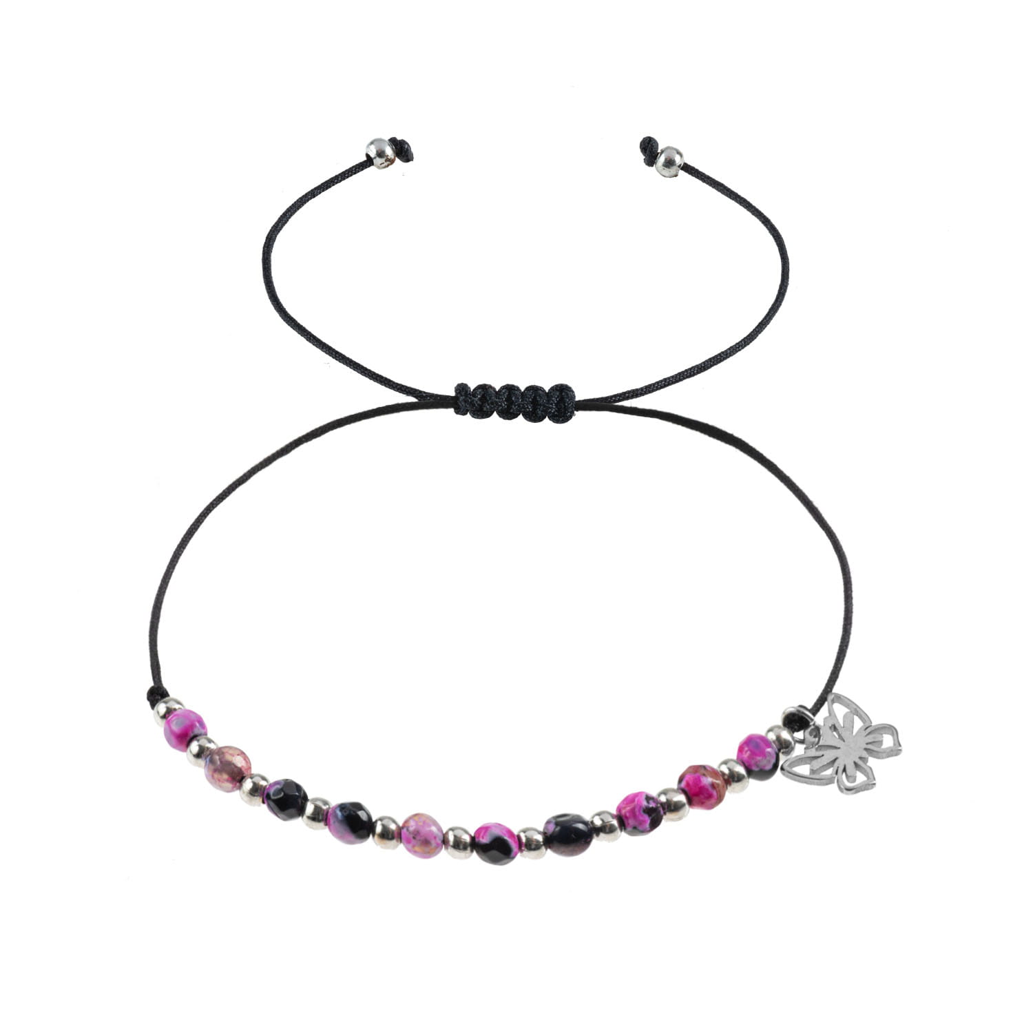 Ręcznie wykonana bransoletka z kamienia naturalnego na czarnym sznurku o regulowanej długości z ozdobną zawieszką ze stali szlachetnej.
