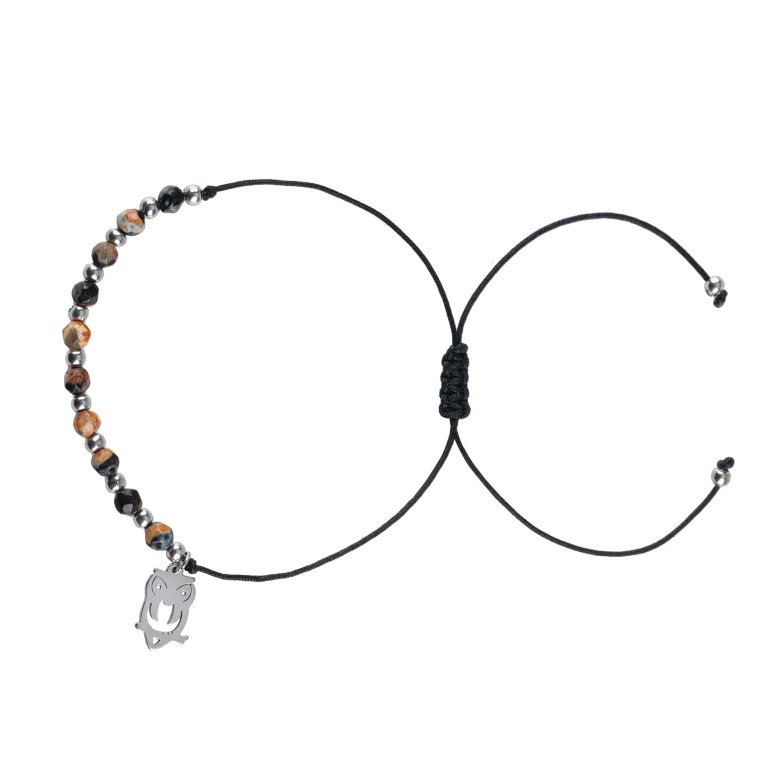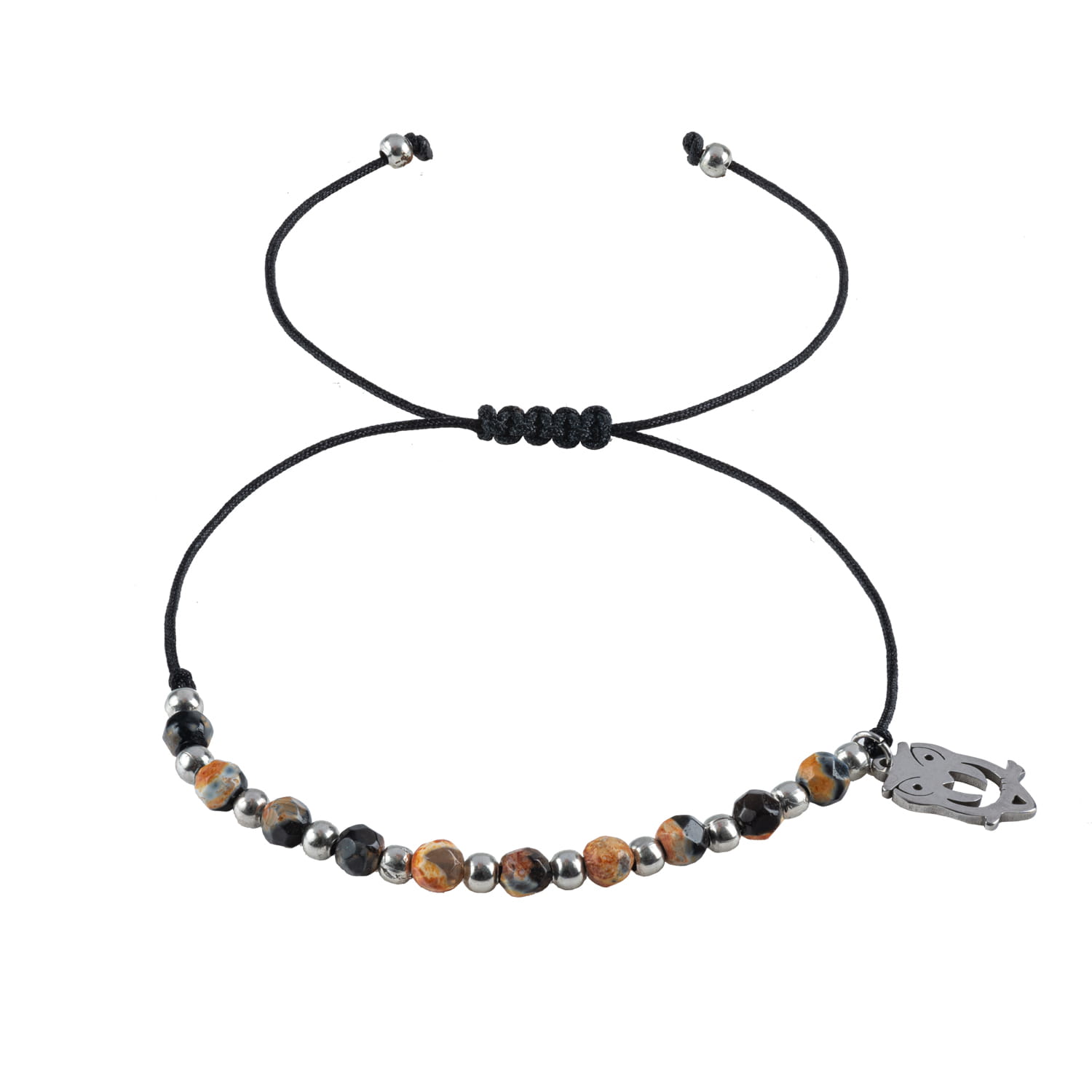 Ręcznie wykonana bransoletka z kamienia naturalnego na czarnym sznurku o regulowanej długości z ozdobną zawieszką ze stali szlachetnej.