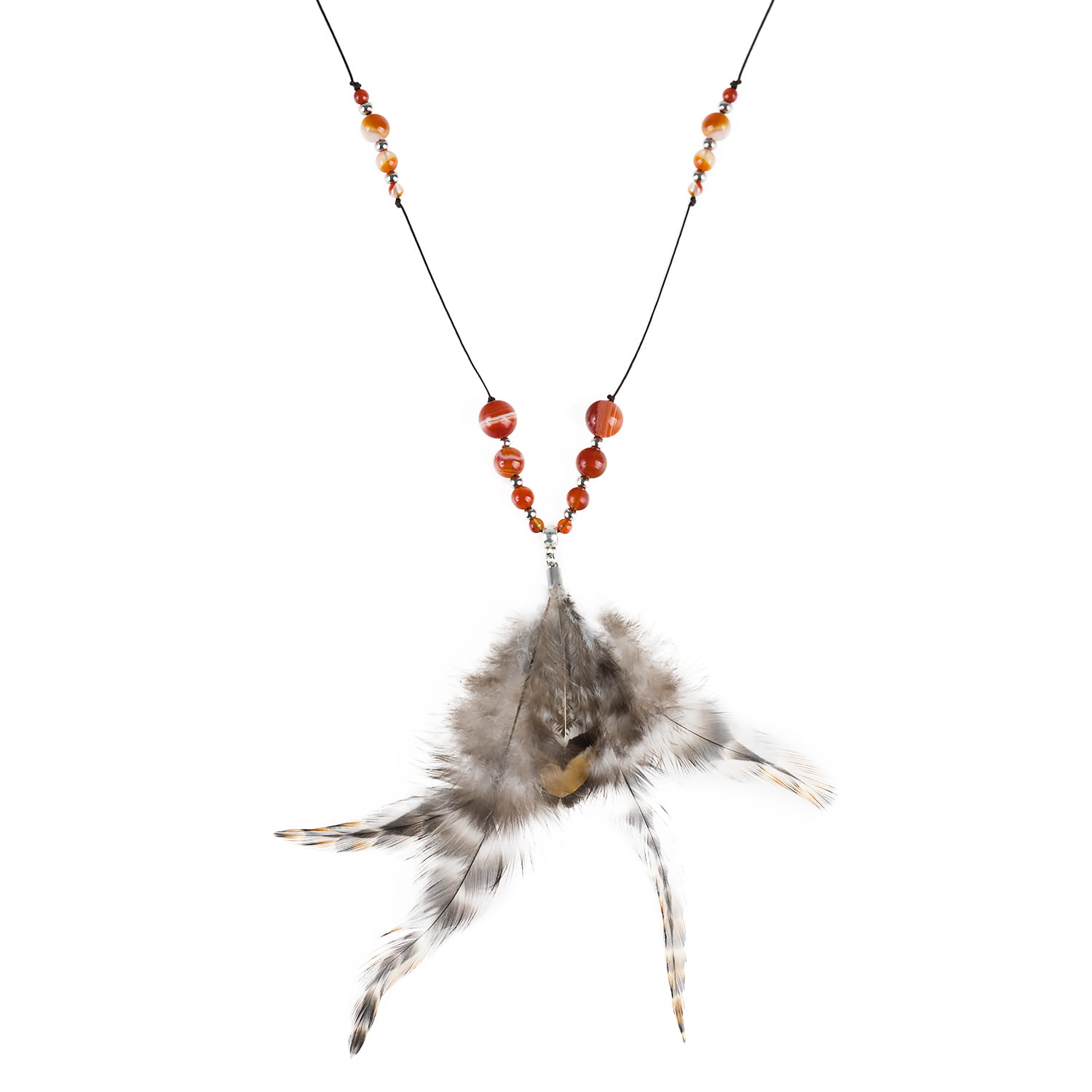 Ręcznie wykonany naszyjnik z naturalnych Piór i kamieni na sznurku o regulowanej długości.