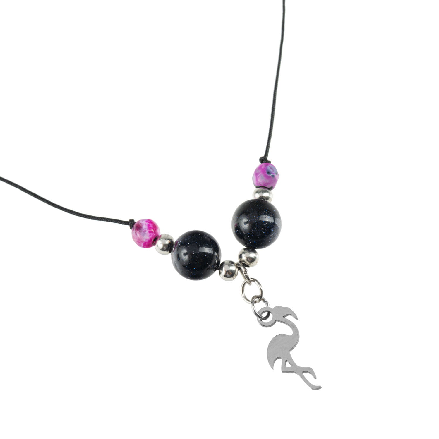 Ręcznie wykonany naszyjnik z kamieni naturalnych na czarnym sznurku o regulowanej długości z ozdobną zawieszką ze stali szlachetnej.