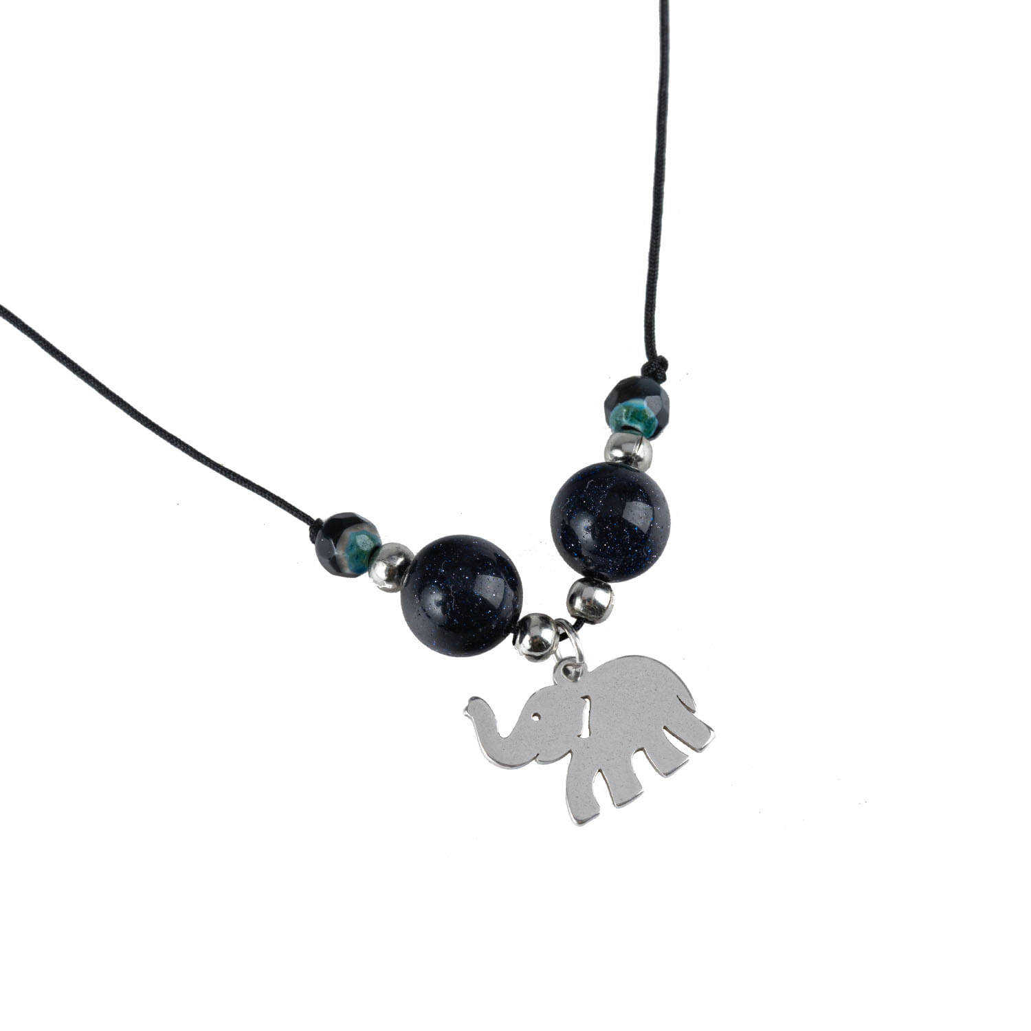 Ręcznie wykonany naszyjnik z kamieni naturalnych na czarnym sznurku o regulowanej długości z ozdobną zawieszką ze stali szlachetnej.