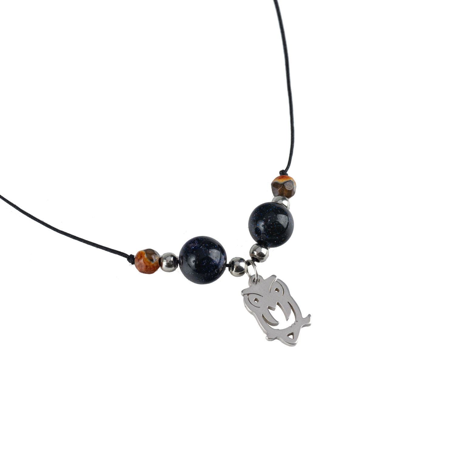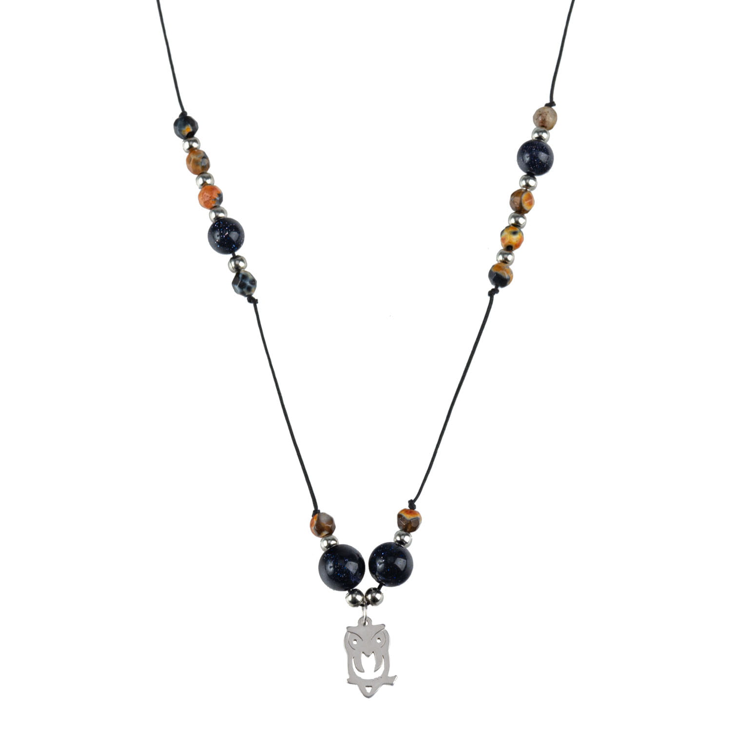 Ręcznie wykonany naszyjnik z kamieni naturalnych na czarnym sznurku o regulowanej długości z ozdobną zawieszką ze stali szlachetnej.