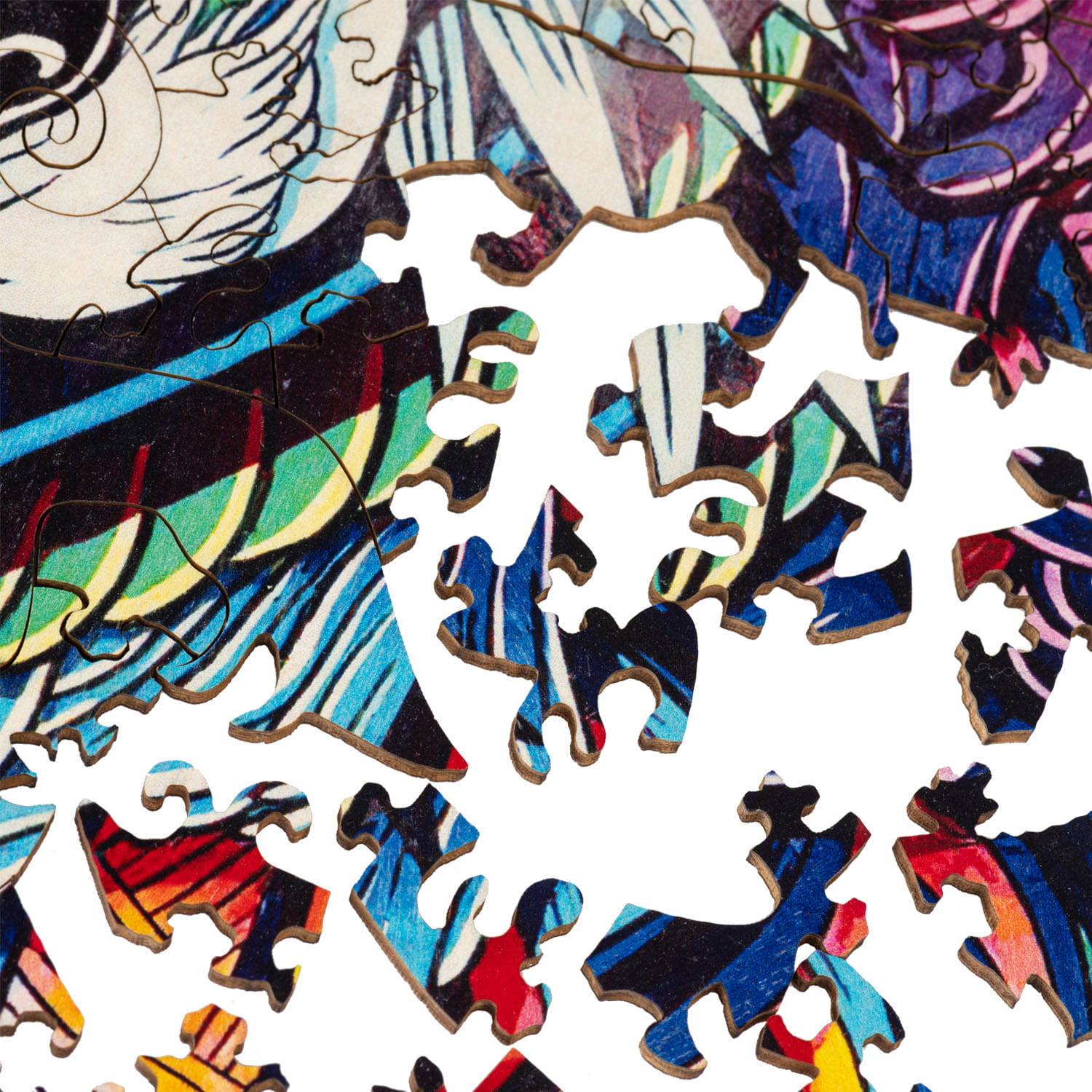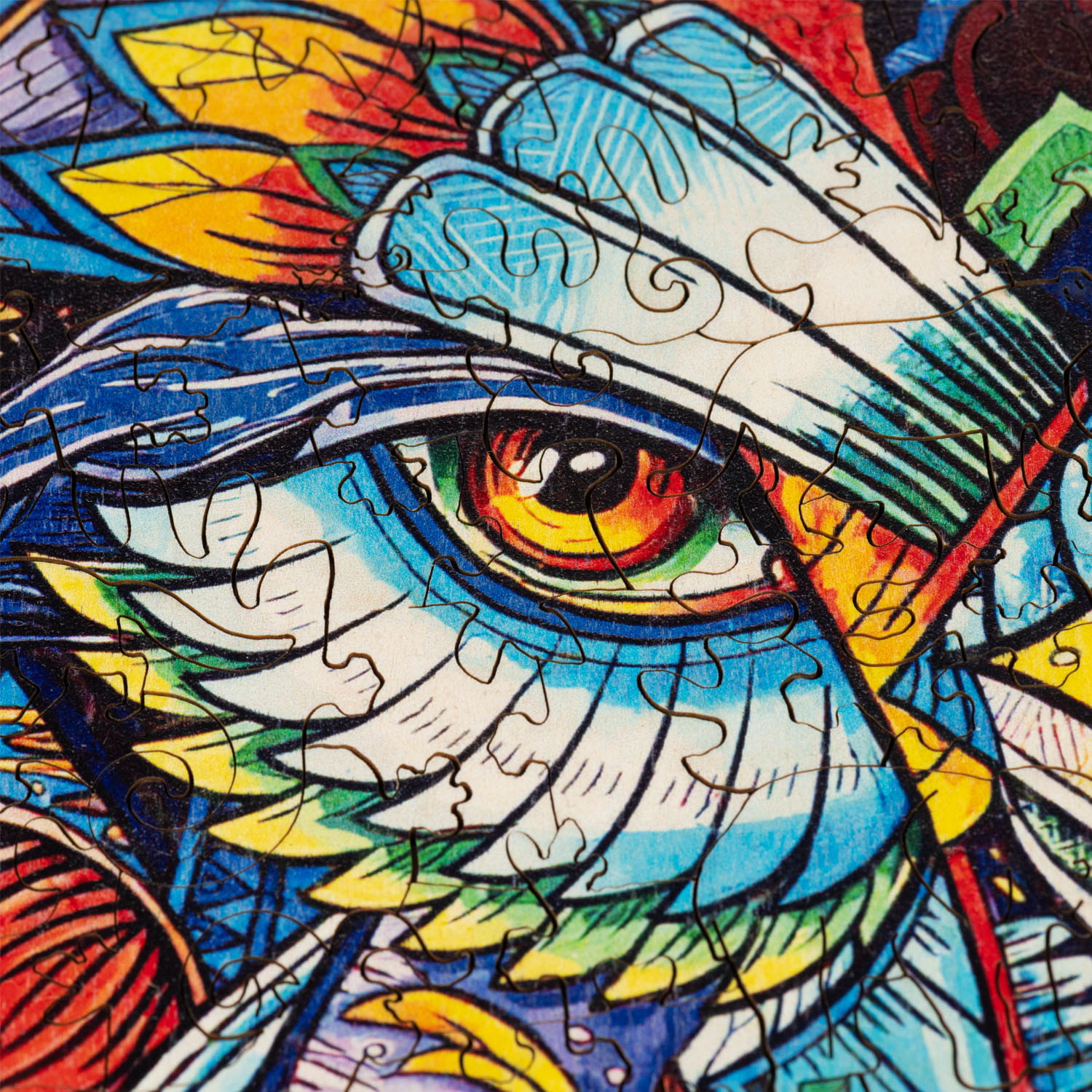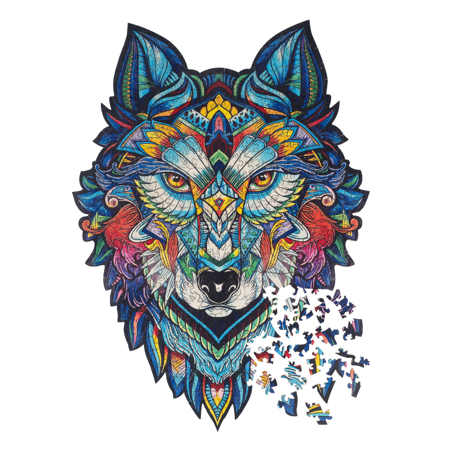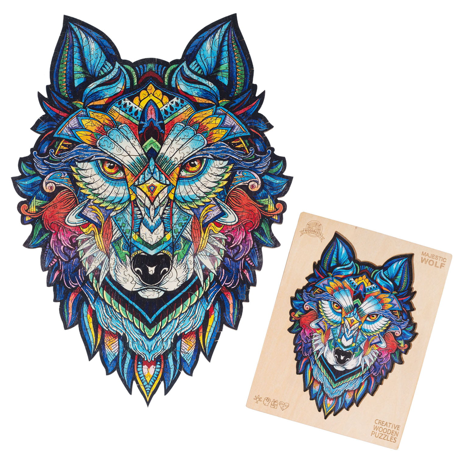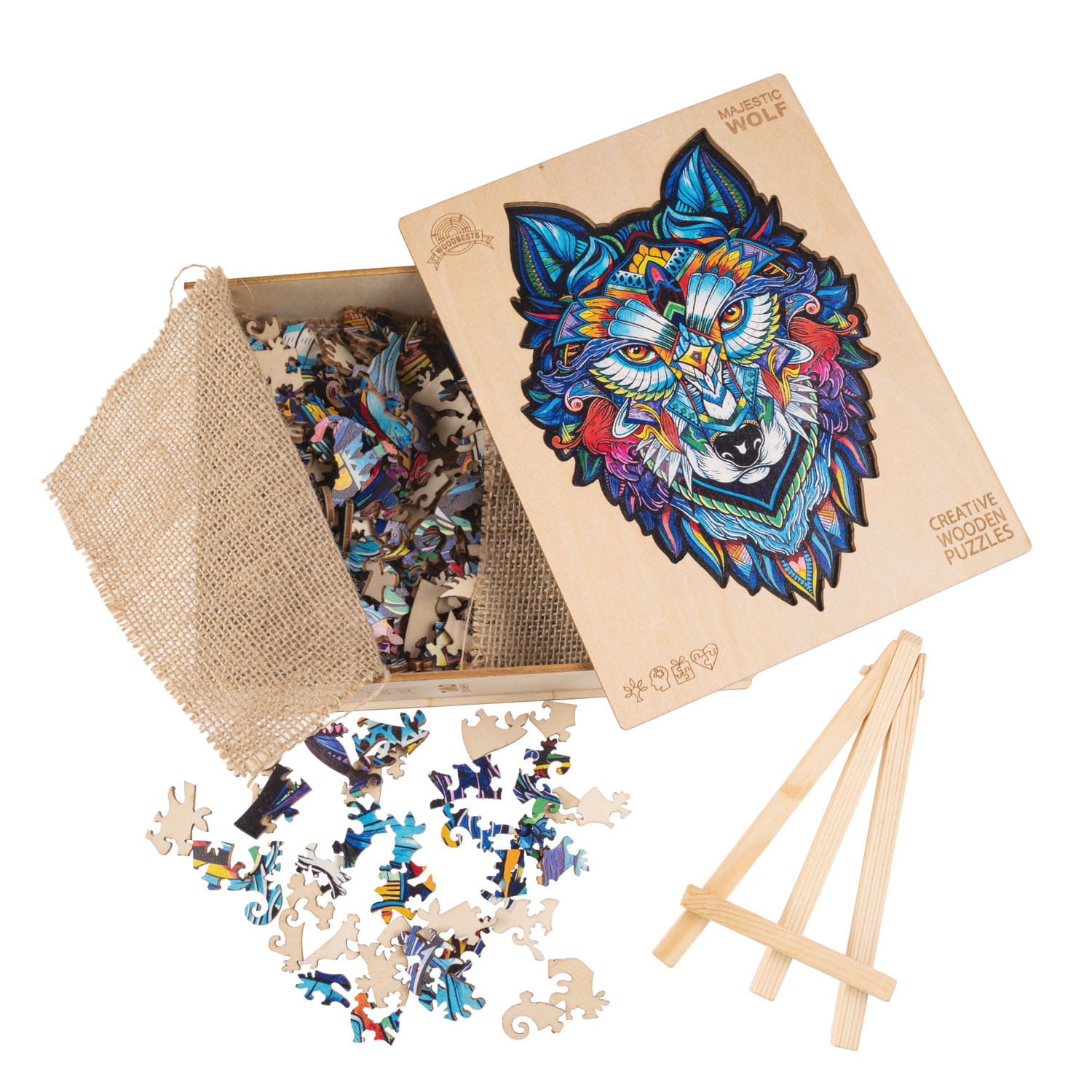 Oryginalne puzzle z drewna, przedstawiające głowę wilka. Każdy element puzzli jest unikalny, stanowi część ukrytej fabuły, która ujawnia się stopniowo, w miarę jak powstaje cały obraz. Wśród nich rozpoznasz charakterystyczne kształty wielu zwierząt, które są elementami barwnego wilka.