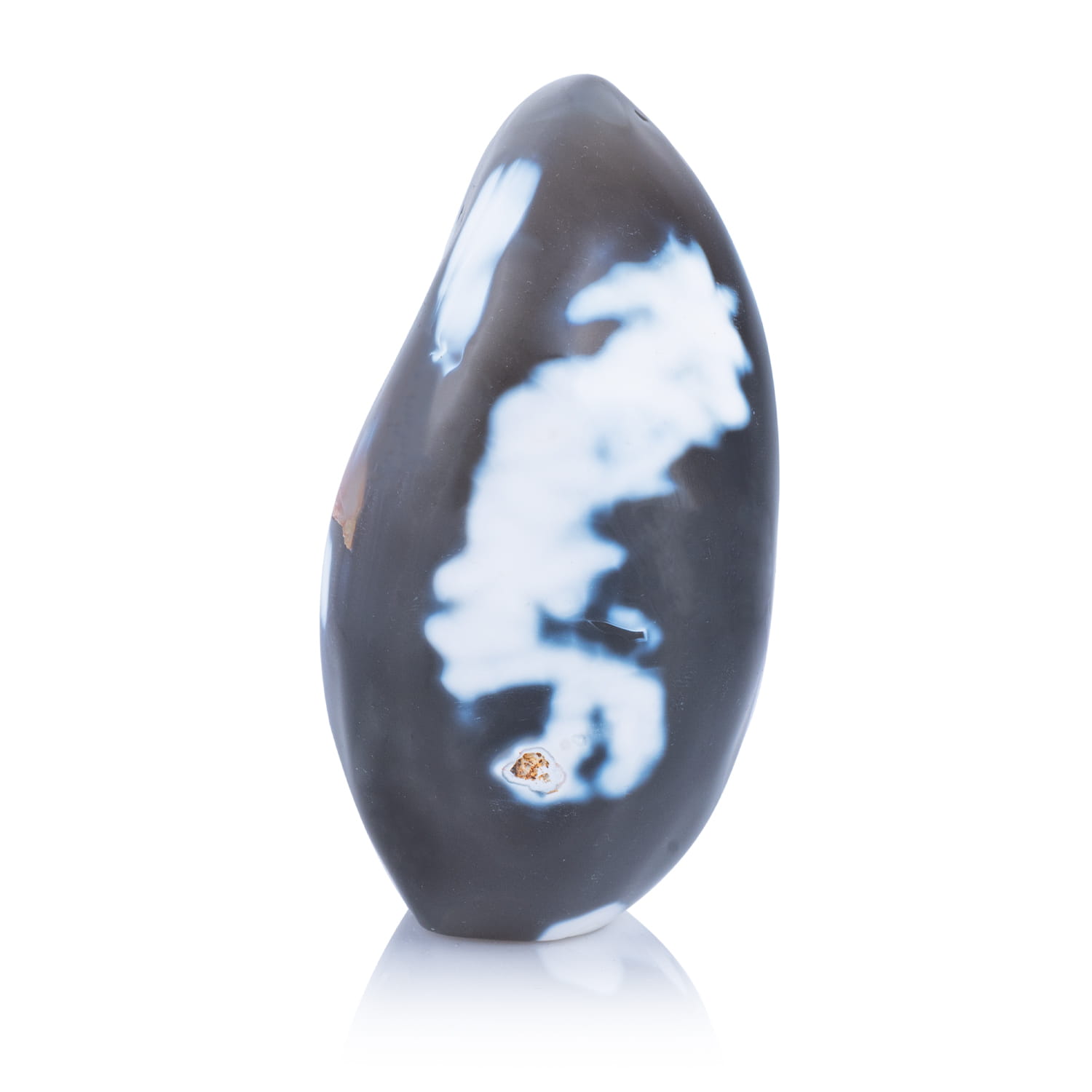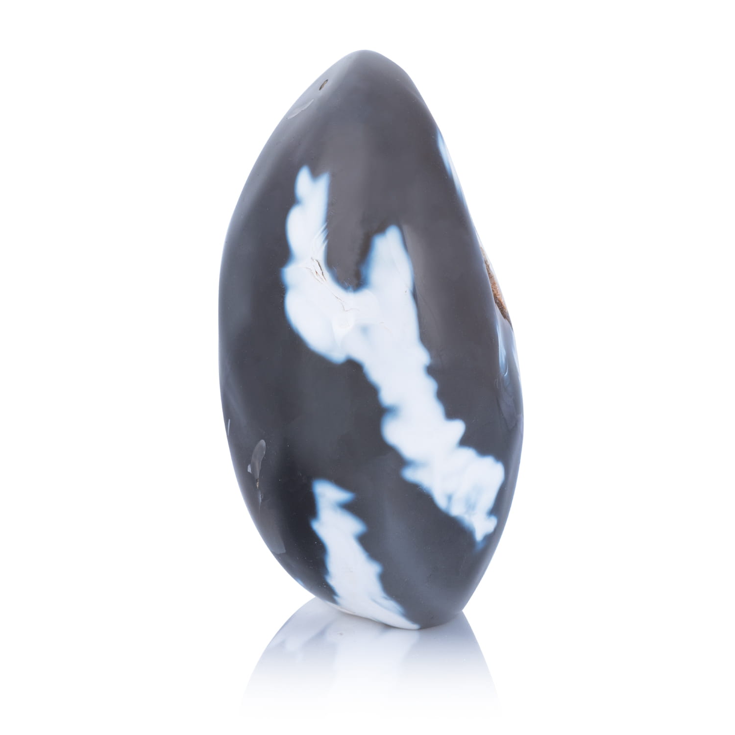 Agat Orka w formie freeform działa jako silny kamień ochronny, pomagając w ochronie przed negatywnymi wpływami zewnętrznymi. Kształt freeform, będący bardziej organiczny i nieregularny, umożliwia swobodny przepływ energii, co sprzyja oczyszczaniu przestrzeni z negatywnej energii. Kamień ten działa jak tarcza ochronna, odpychając wszelkie negatywne wibracje i blokady energetyczne.
