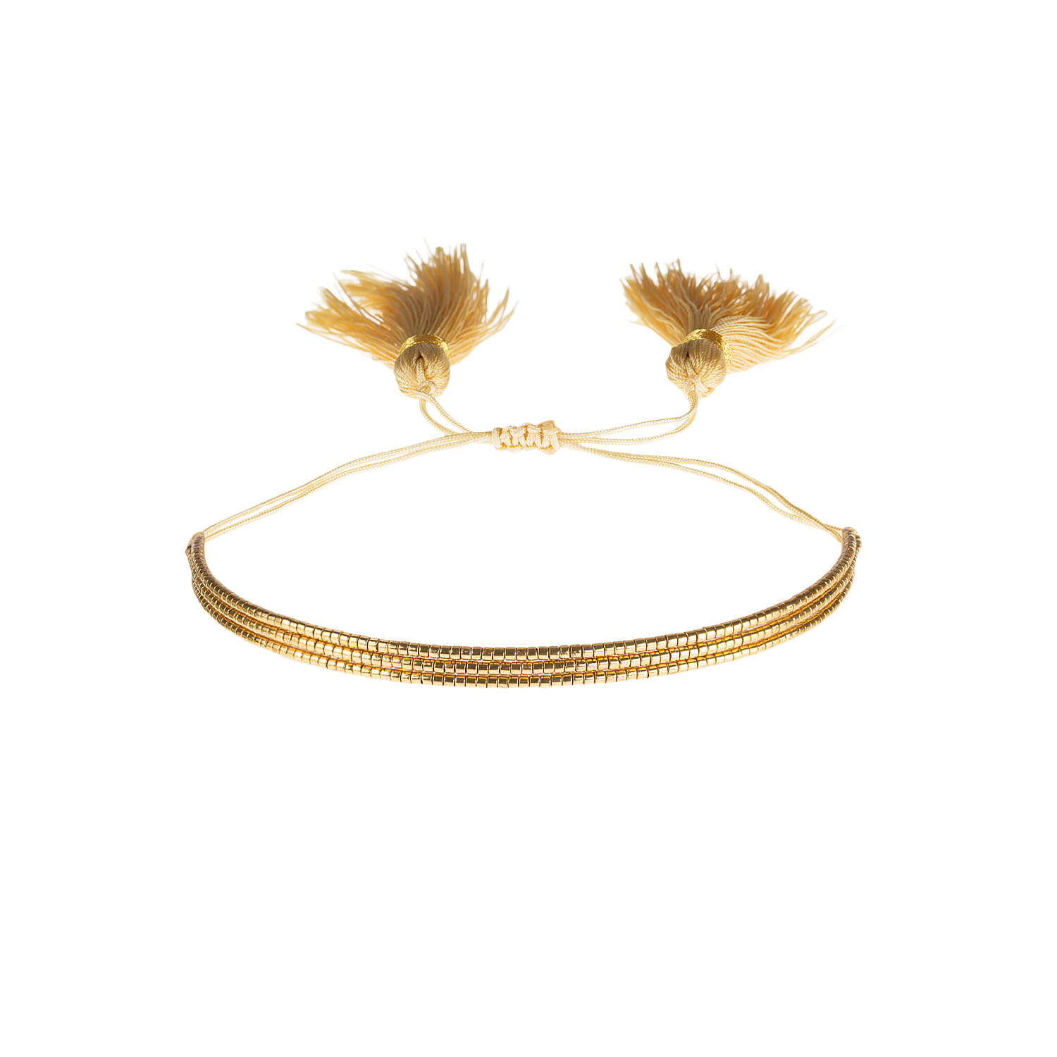 Bransoletka w stylu boho wykonana techniką beadingu z koralików Miyuki ułożonych w geometryczny wzór na sznurku o regulowanej długości. Końce sznurka ozdobione zostały chwostami.