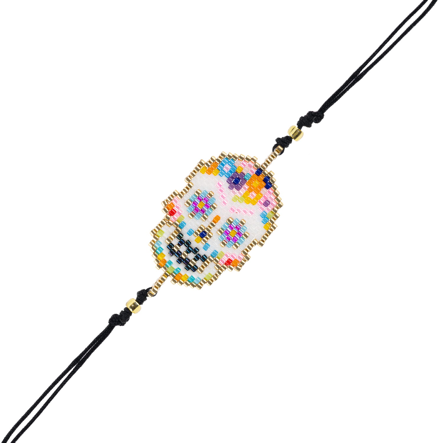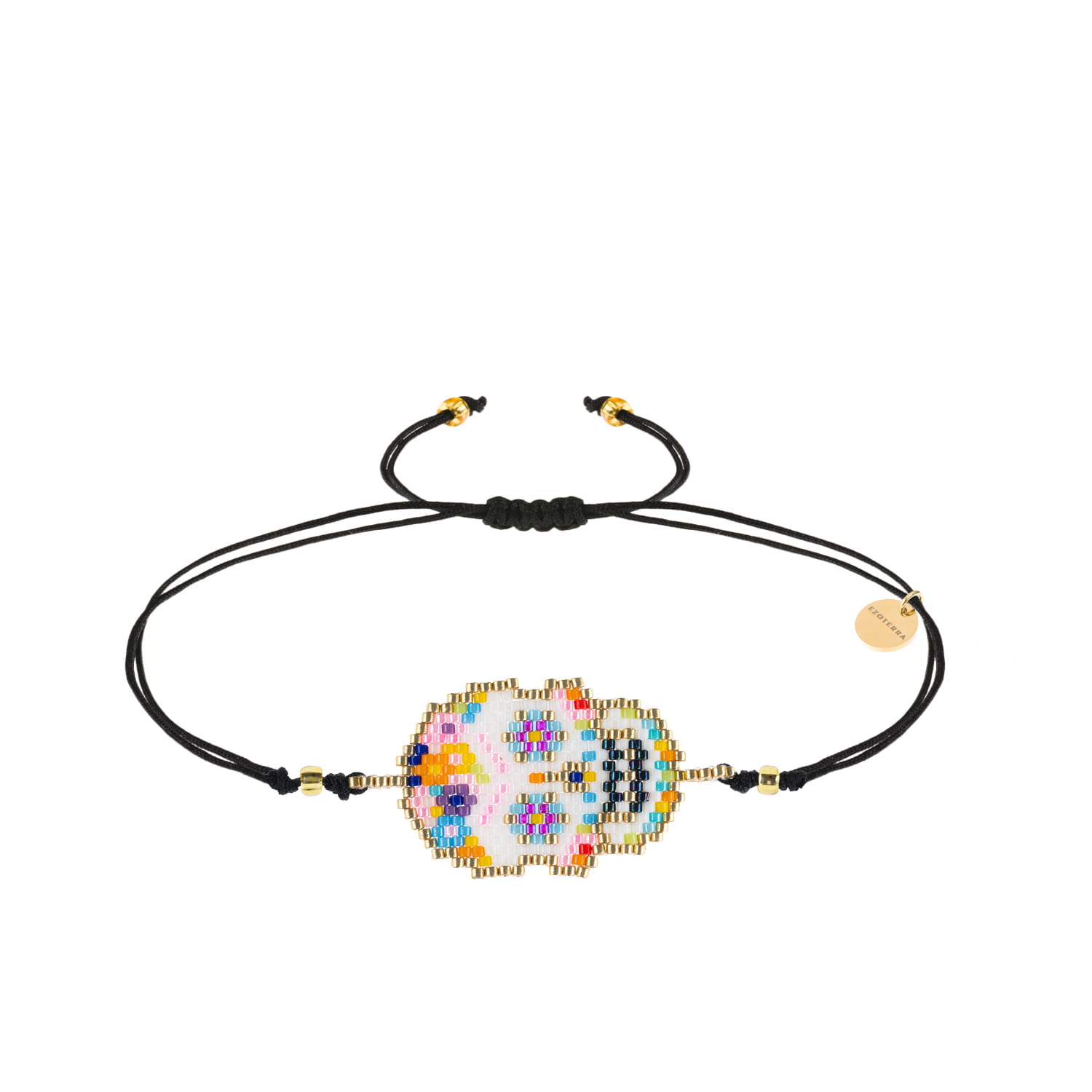 Bransoletka w stylu boho wykonana techniką beadingu z koralików Miyuki ułożonych w geometryczny wzór na sznurku o regulowanej długości. Końce sznurka ozdobione zostały złotymi koralikami.