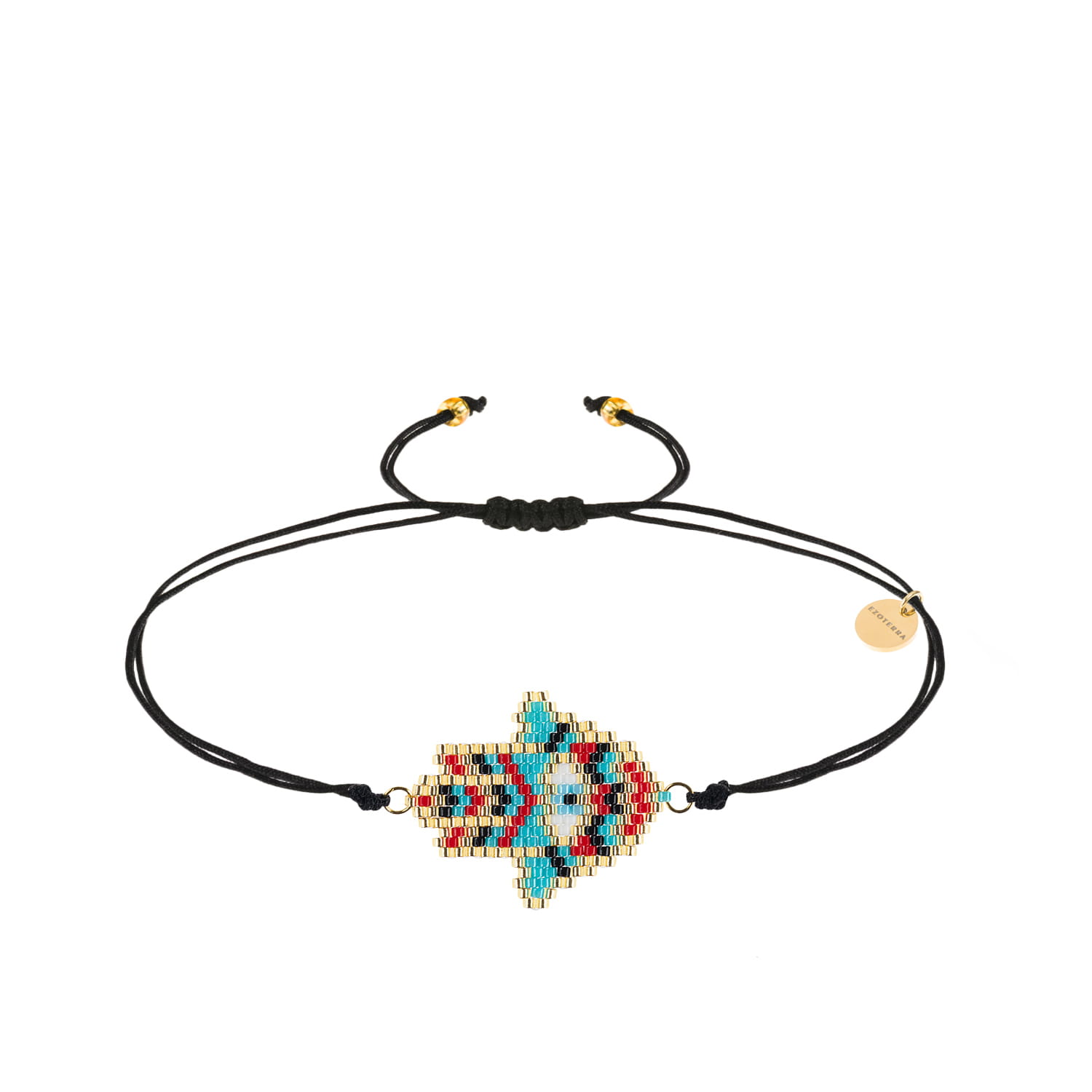 Bransoletka w stylu boho wykonana techniką beadingu z koralików Miyuki ułożonych w geometryczny wzór na sznurku o regulowanej długości. Końce sznurka ozdobione zostały złotymi koralikami.
