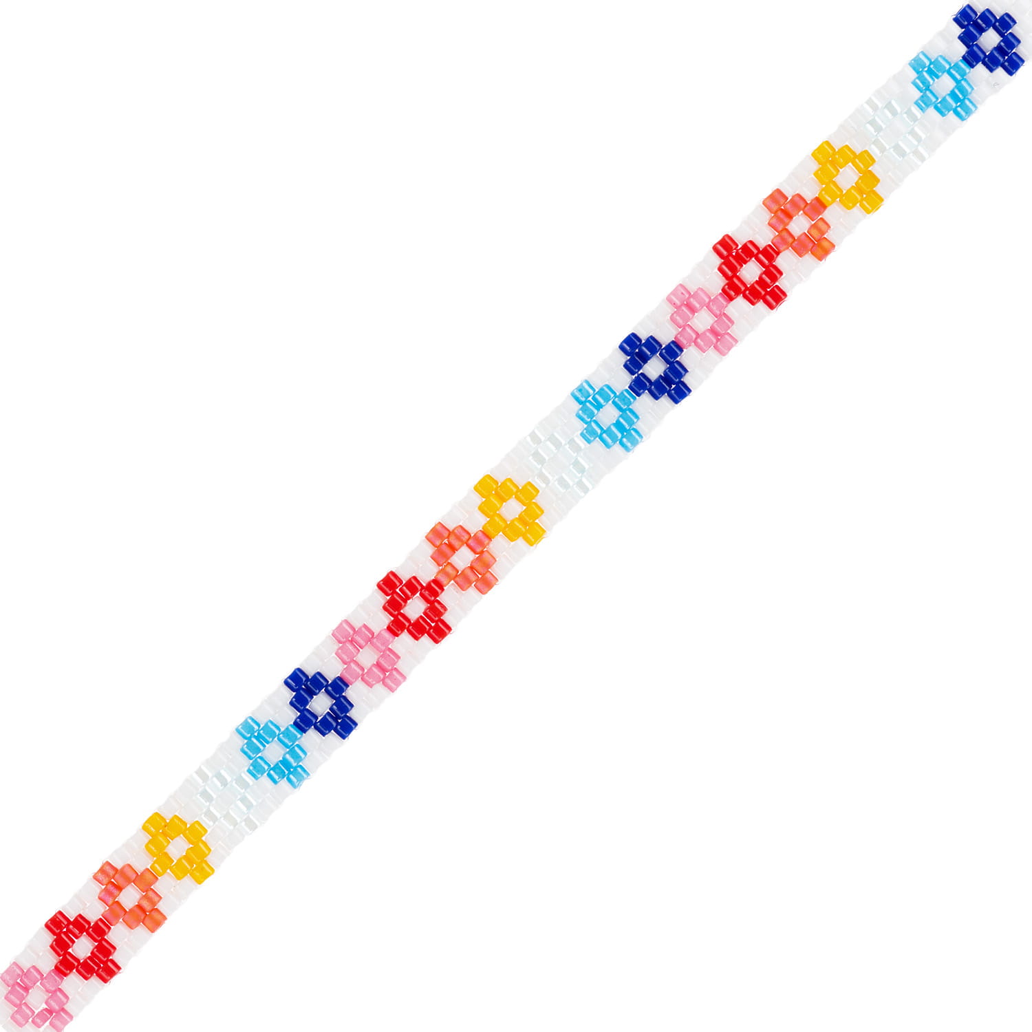 Bransoletka w stylu boho wykonana techniką beadingu z koralików Miyuki ułożonych w geometryczny wzór na sznurku o regulowanej długości. Końce sznurka ozdobione zostały złotymi koralikami.