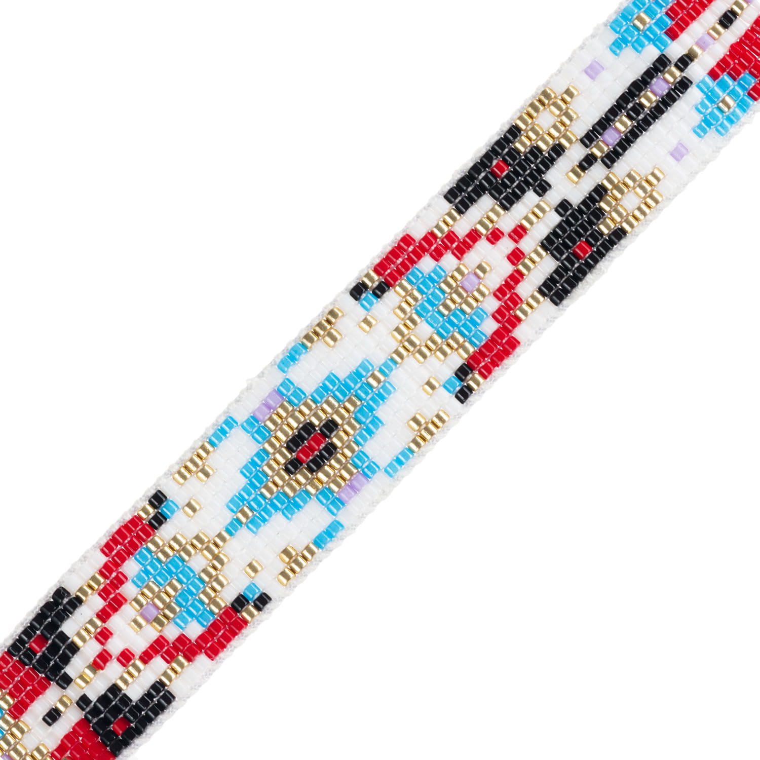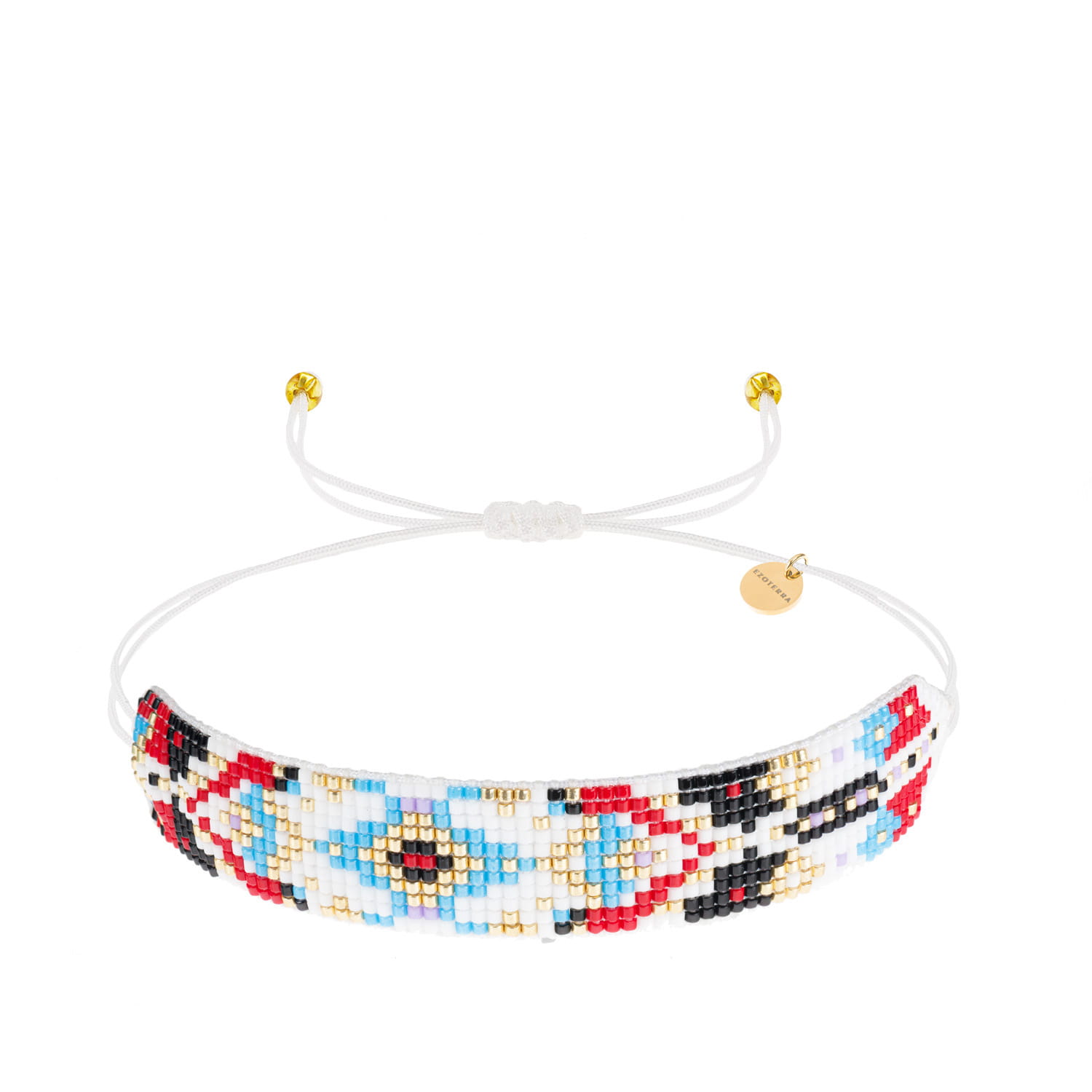 Bransoletka w stylu boho wykonana techniką beadingu z koralików Miyuki ułożonych w geometryczny wzór na sznurku o regulowanej długości. Końce sznurka ozdobione zostały złotymi koralikami.