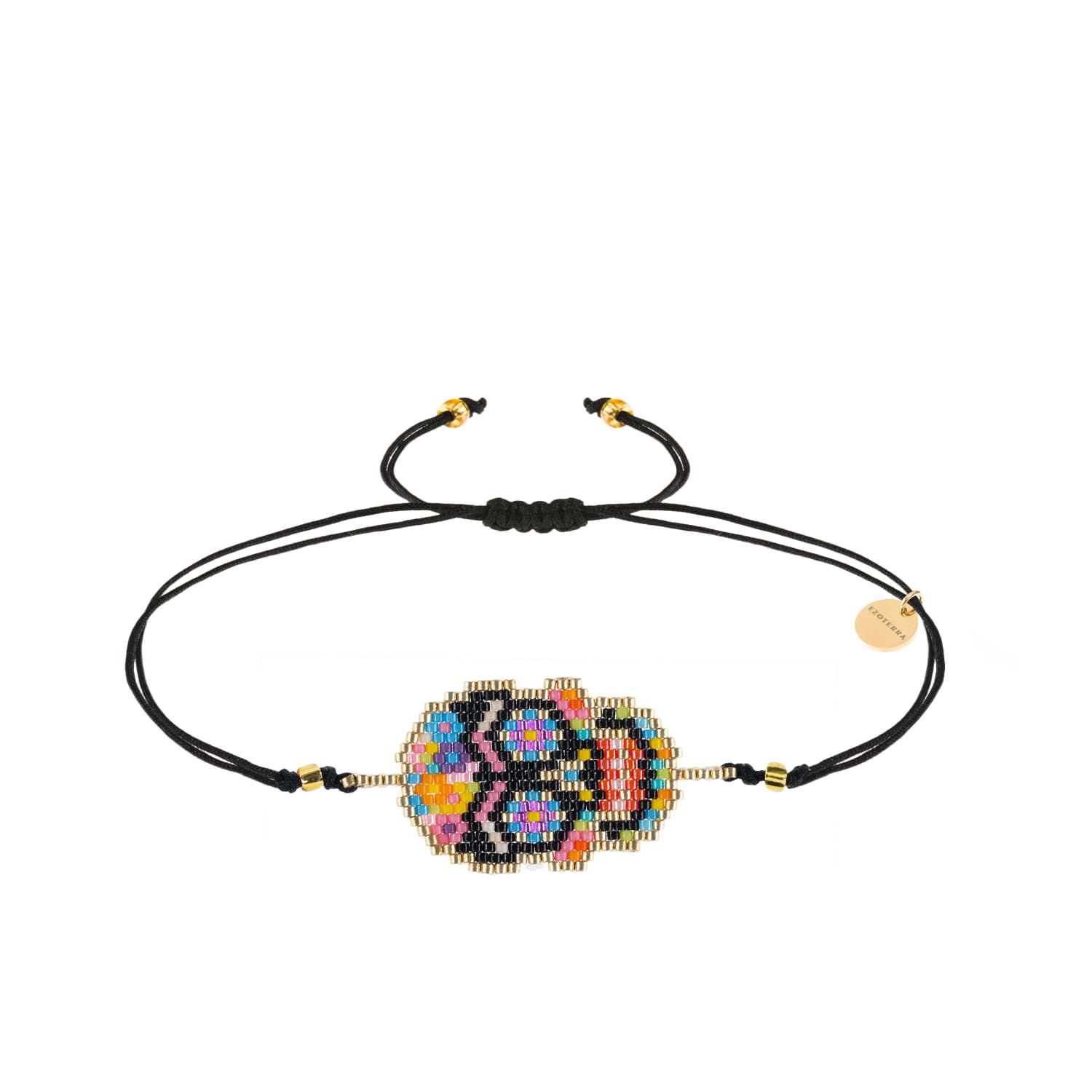 Bransoletka w stylu boho wykonana techniką beadingu z koralików Miyuki ułożonych w geometryczny wzór na sznurku o regulowanej długości. Końce sznurka ozdobione zostały złotymi koralikami.