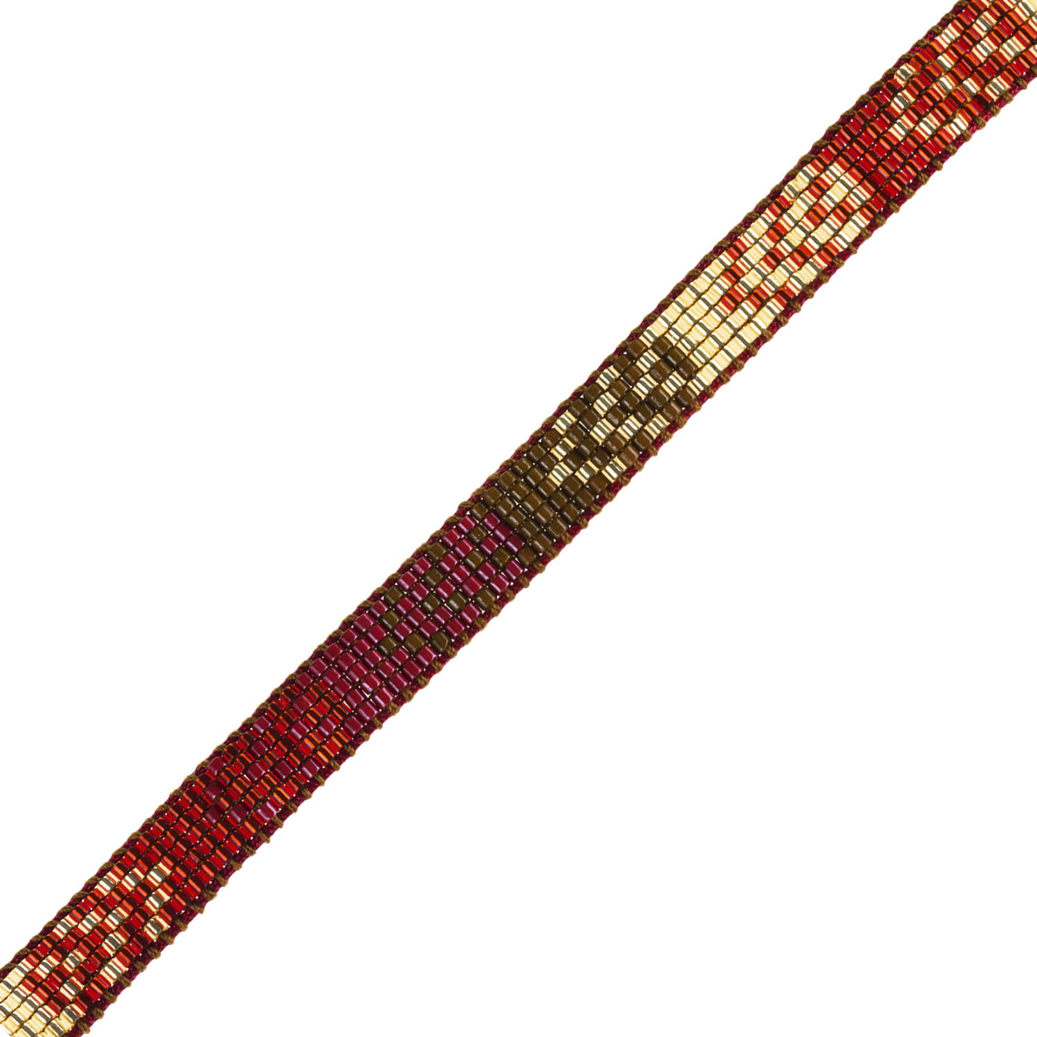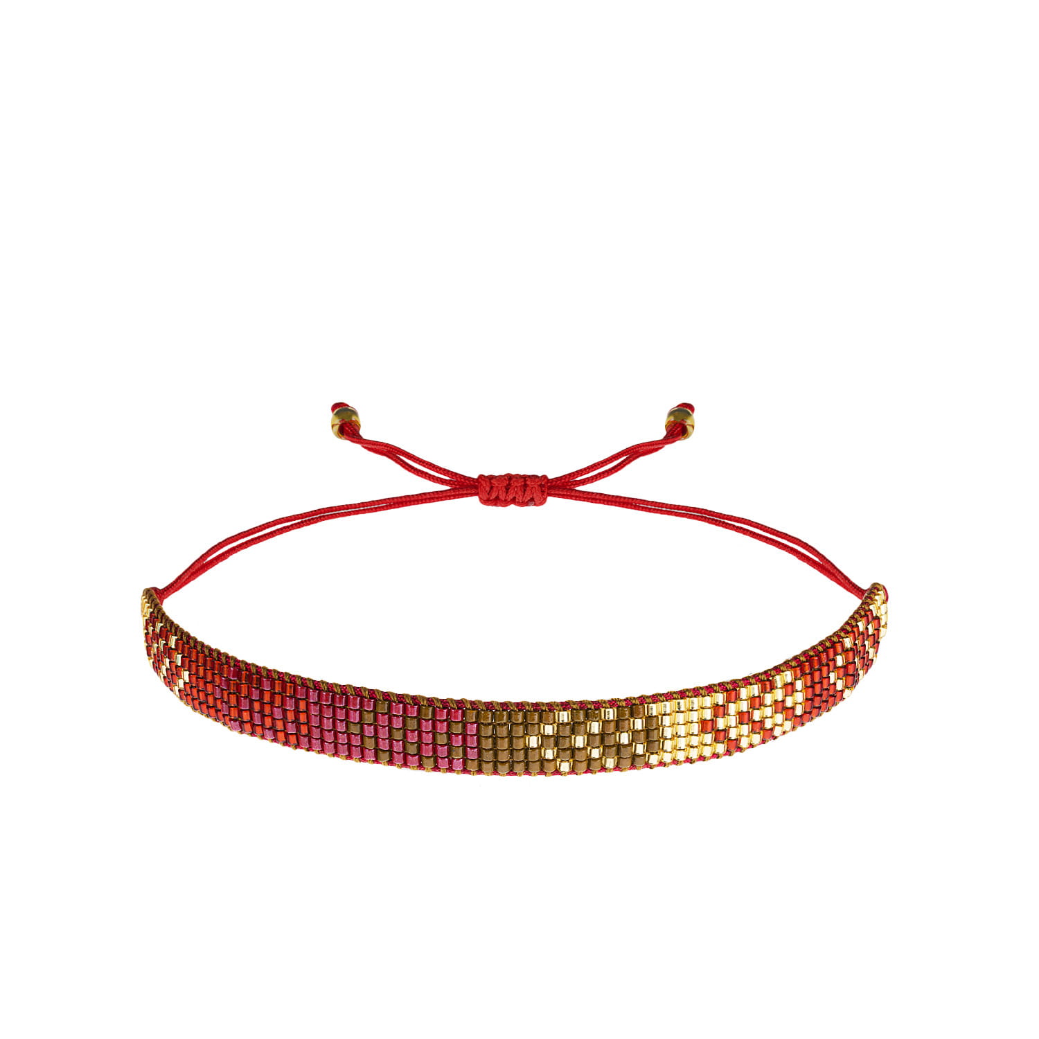 Bransoletka w stylu boho wykonana techniką beadingu z koralików Miyuki ułożonych w geometryczny wzór na sznurku o regulowanej długości. Końce sznurka ozdobione zostały złotymi koralikami.