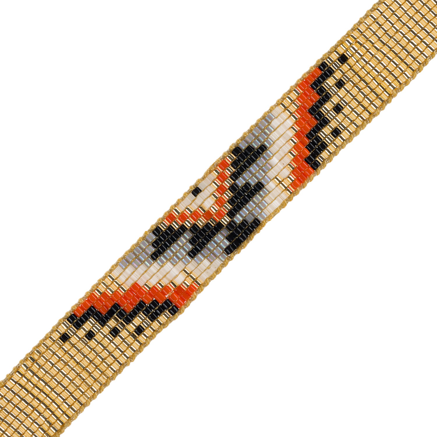Bransoletka w stylu boho wykonana techniką beadingu z koralików Miyuki ułożonych w geometryczny wzór na sznurku o regulowanej długości. Końce sznurka ozdobione zostały złotymi koralikami.