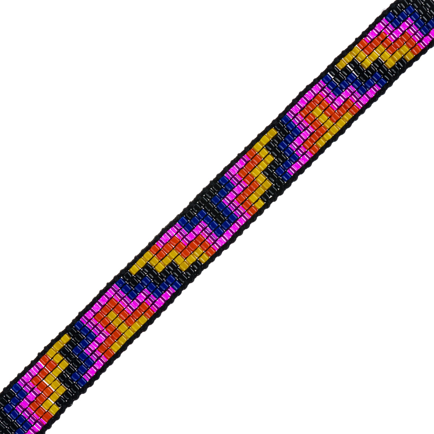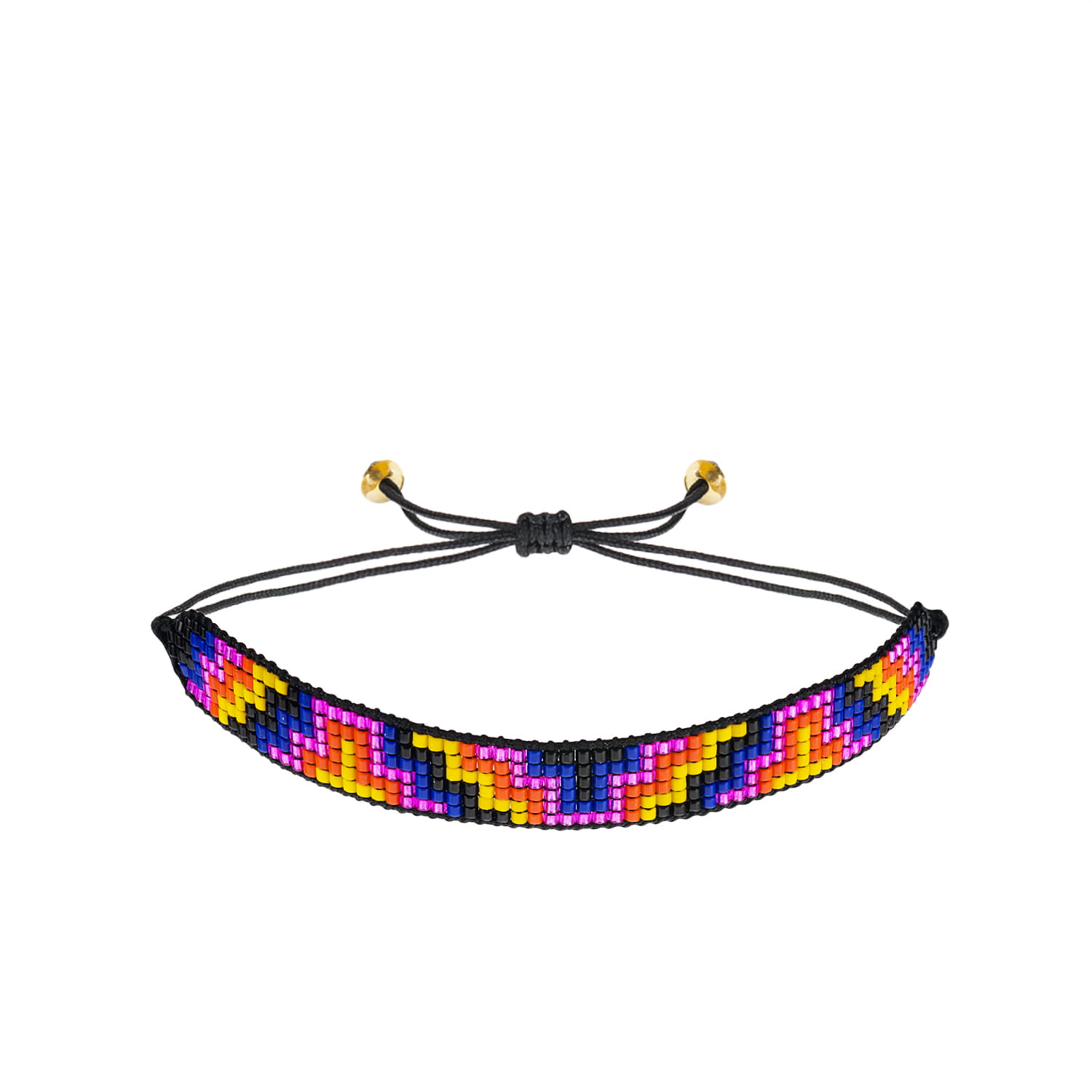 Bransoletka w stylu boho wykonana techniką beadingu z koralików Miyuki ułożonych w geometryczny wzór na sznurku o regulowanej długości. Końce sznurka ozdobione zostały złotymi koralikami.