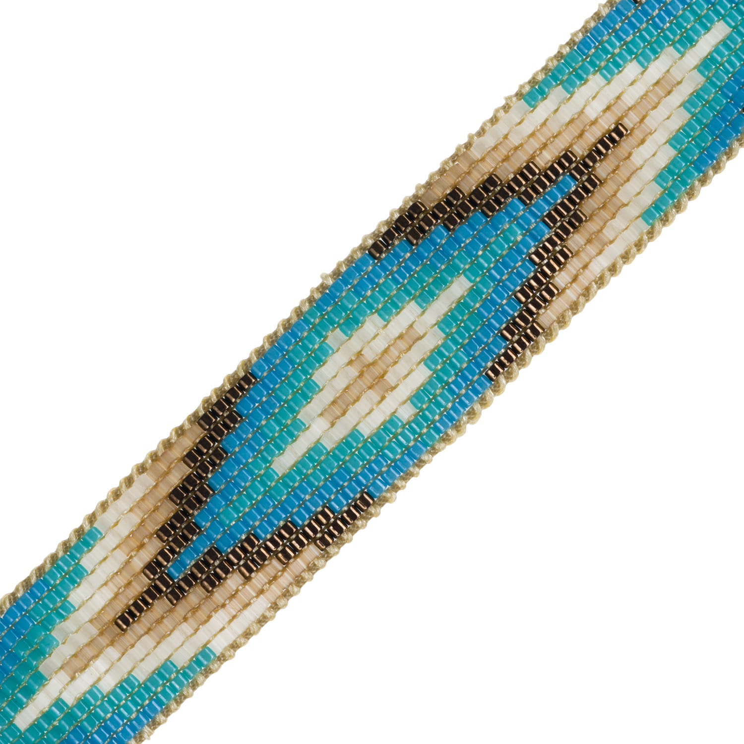 Bransoletka w stylu boho wykonana techniką beadingu z koralików Miyuki ułożonych w geometryczny wzór na sznurku o regulowanej długości. Końce sznurka ozdobione zostały złotymi koralikami.