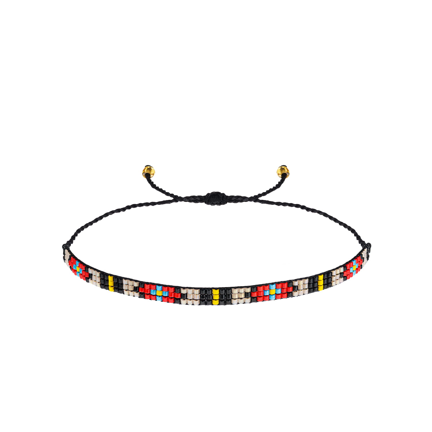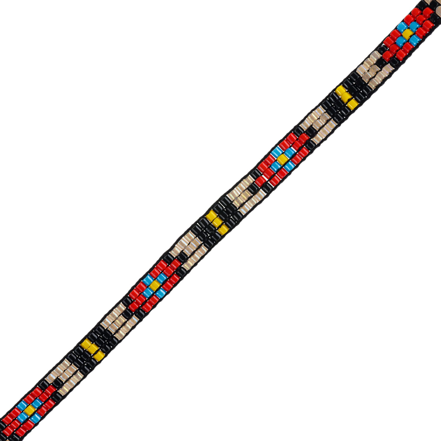 Bransoletka w stylu boho wykonana techniką beadingu z koralików Miyuki ułożonych w geometryczny wzór na sznurku o regulowanej długości. Końce sznurka ozdobione zostały złotymi koralikami.