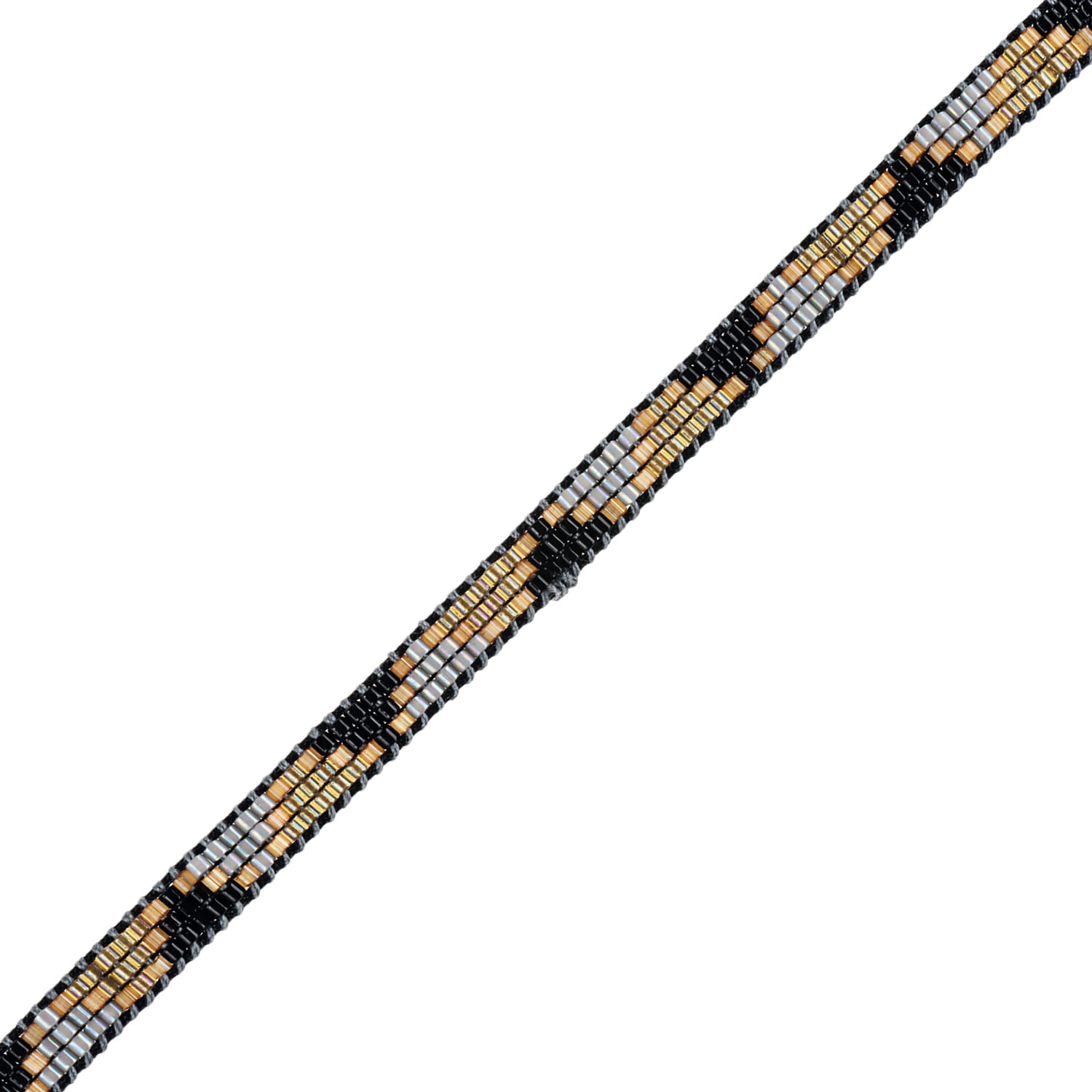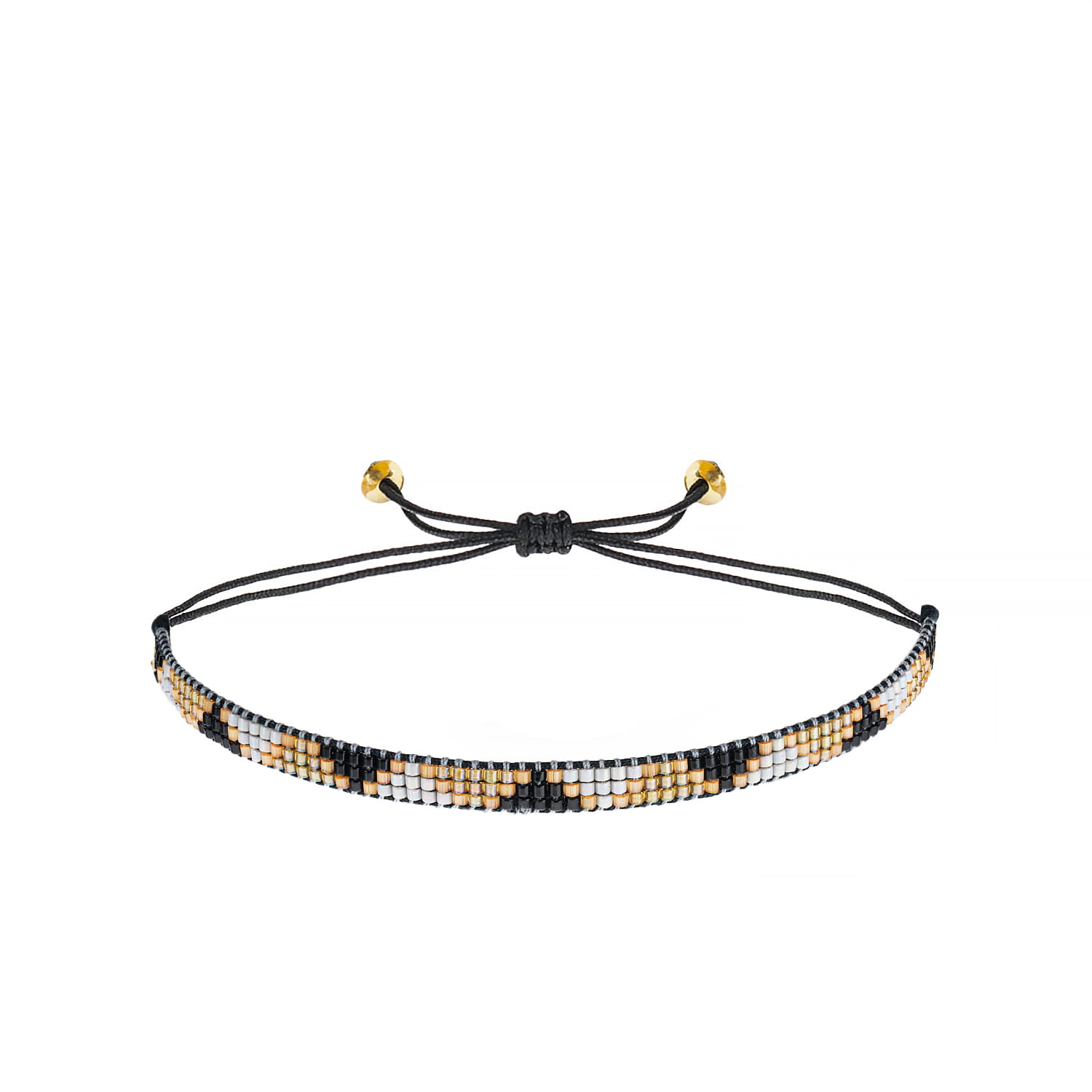 Bransoletka w stylu boho wykonana techniką beadingu z koralików Miyuki ułożonych w geometryczny wzór na sznurku o regulowanej długości. Końce sznurka ozdobione zostały złotymi koralikami.