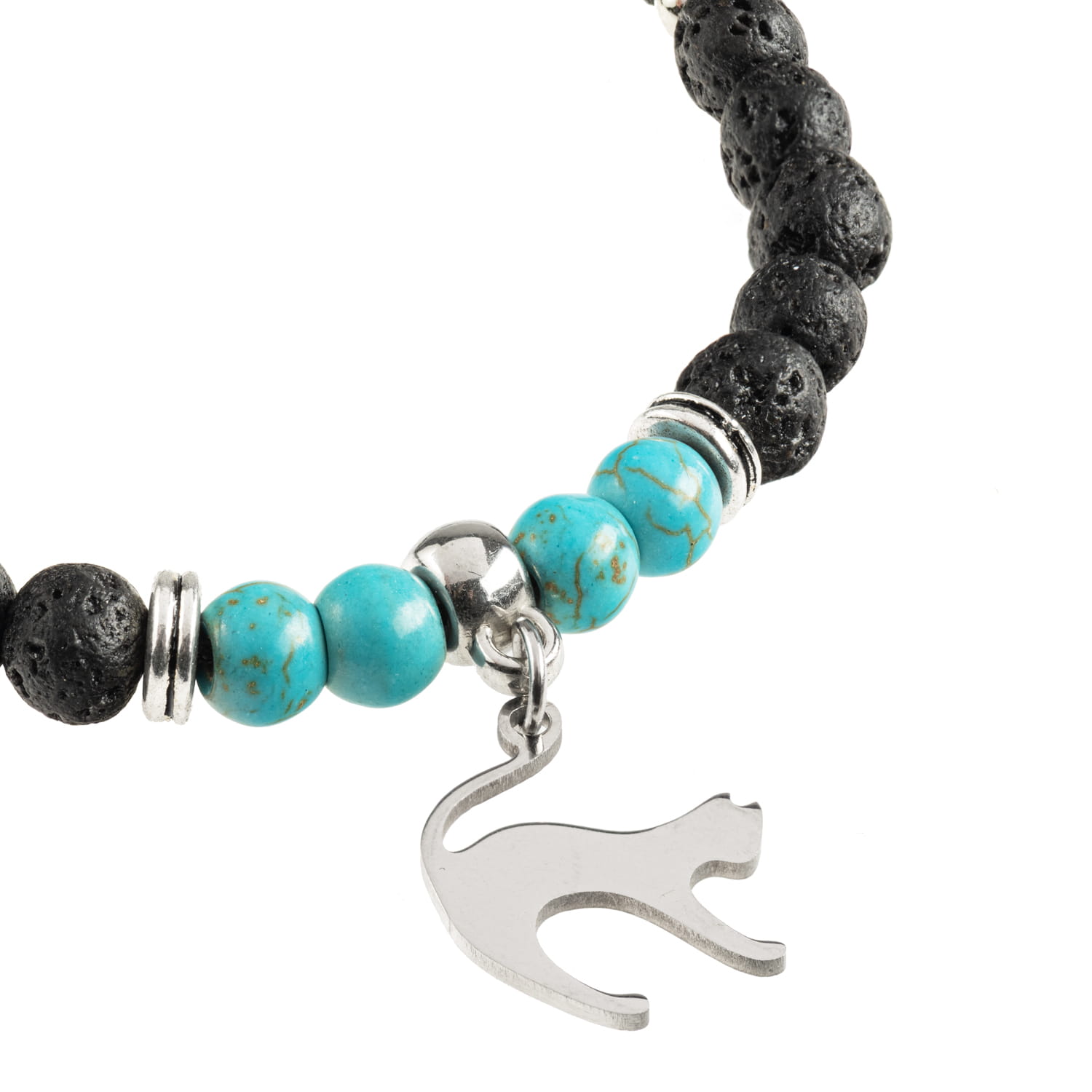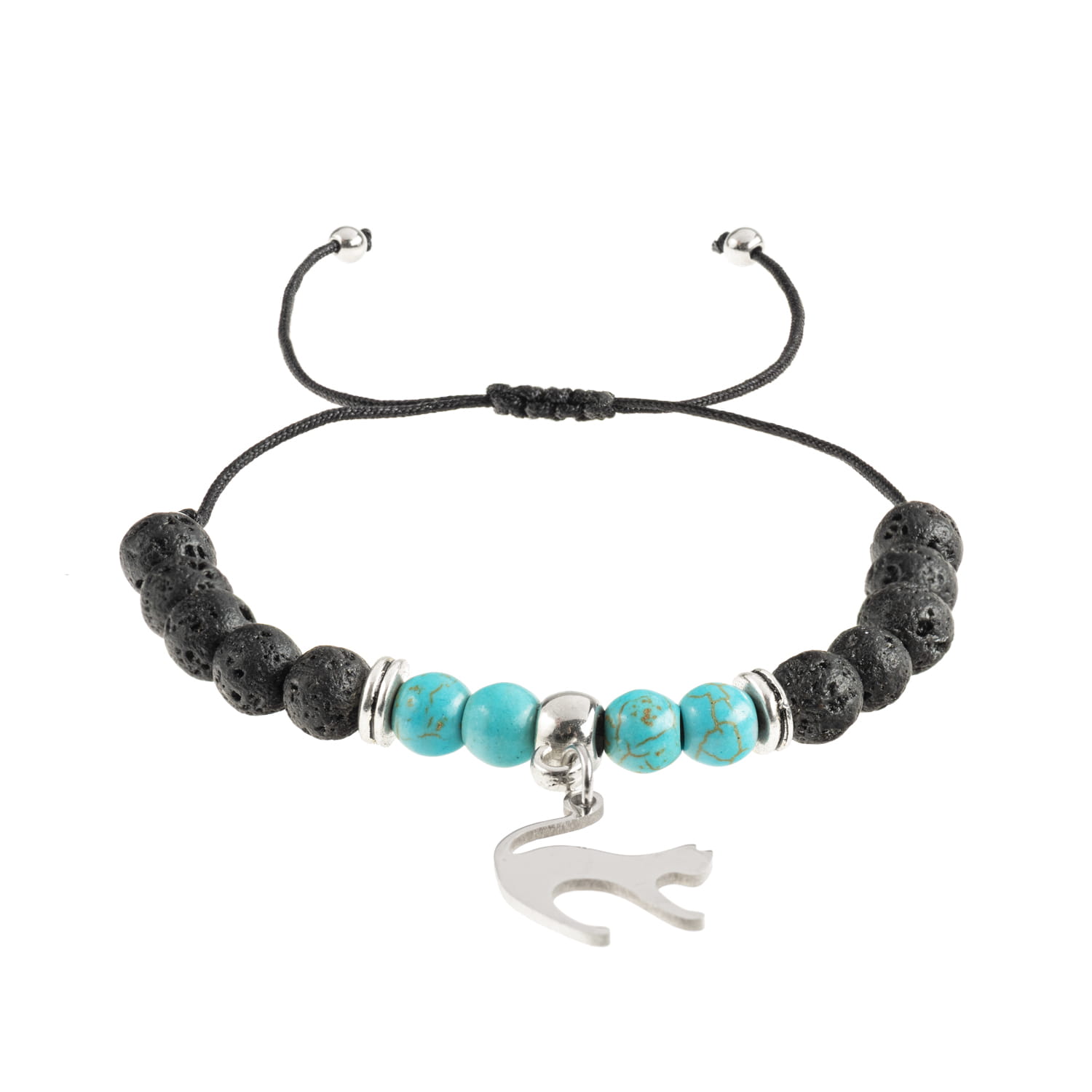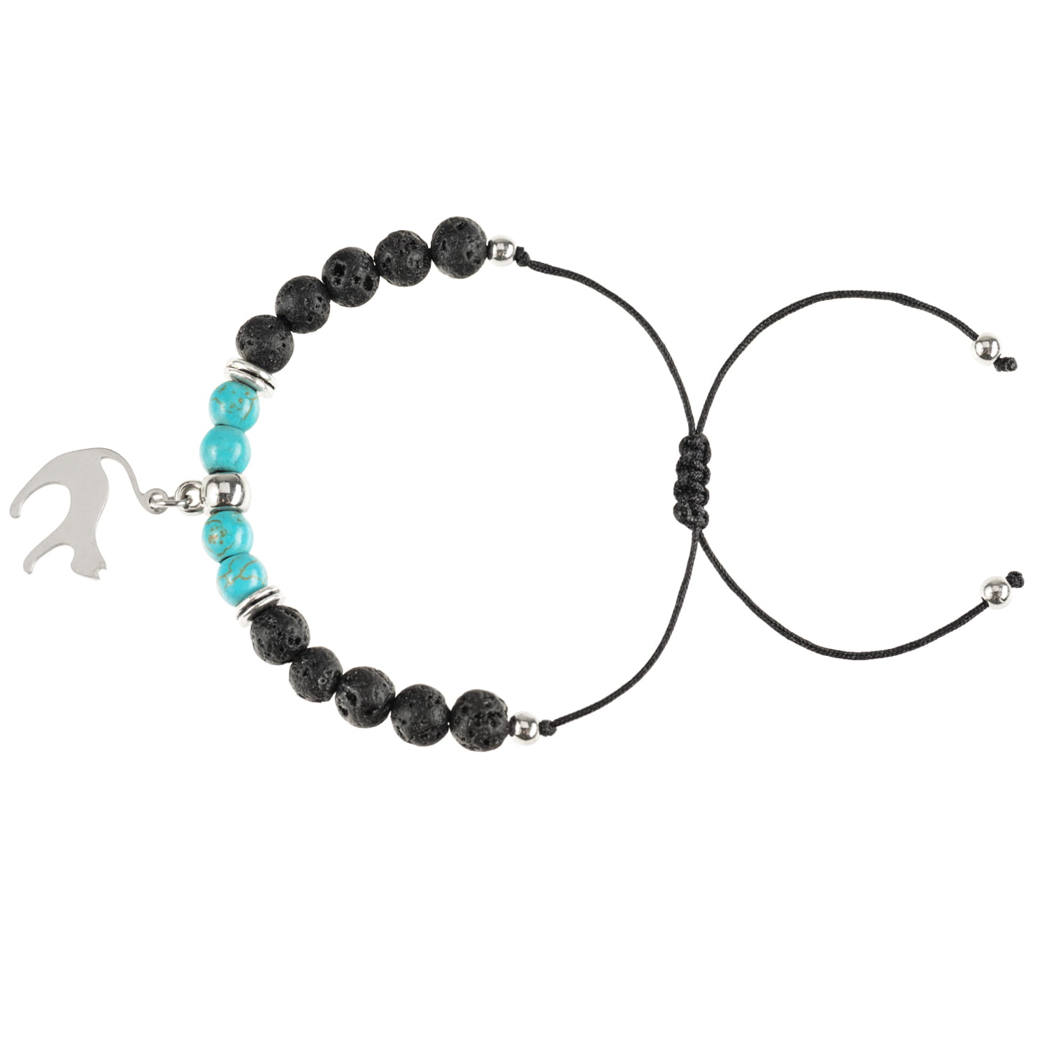 Ręcznie wykonana bransoletka z kamienia naturalnego na czarnym sznurku o regulowanej długości z ozdobną zawieszką ze stali szlachetnej.