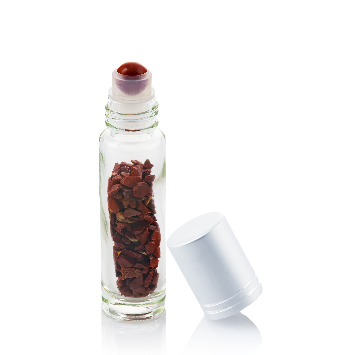 Szklana buteleczka z kryształami idealna do stosowania z naturalnymi olejkami. Buteleczka posiada kulkową końcówkę wykonaną z kamienia naturalnego.