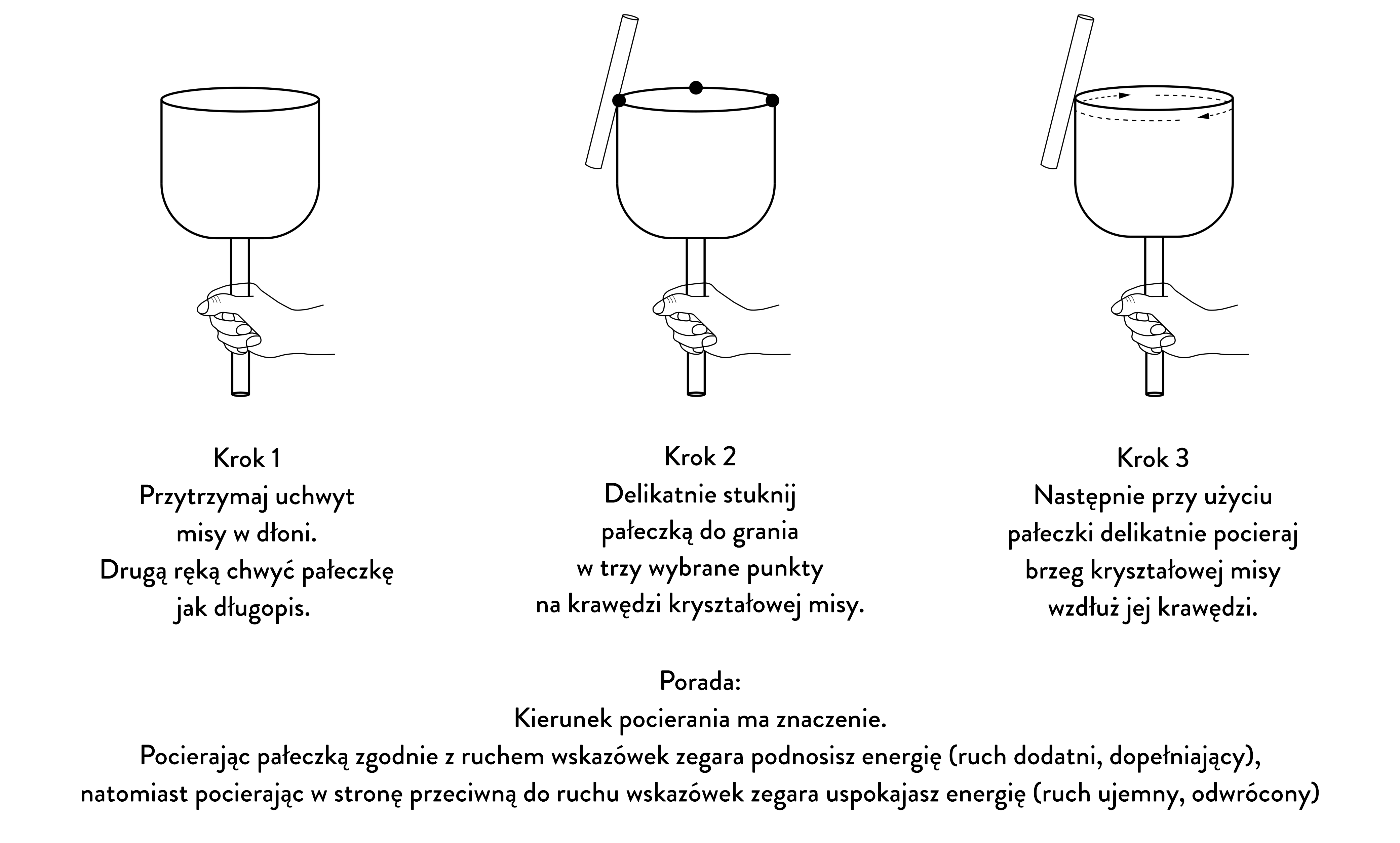 Pałeczkę można prowadzić w dowolnym kierunku, choć kierunek pocierania ma znaczenie. Pocierając pałeczką zgodnie z ruchem wskazówek zegara podnosisz energię (ruch dodatni, dopełniający), natomiast pocierając w stronę przeciwną do ruchu wskazówek zegara uspokajasz energię (ruch ujemny, odwrócony). Gdy przestaniesz prowadzić pałeczkę po obręczy misy, dźwięk zacznie się wyciszać.