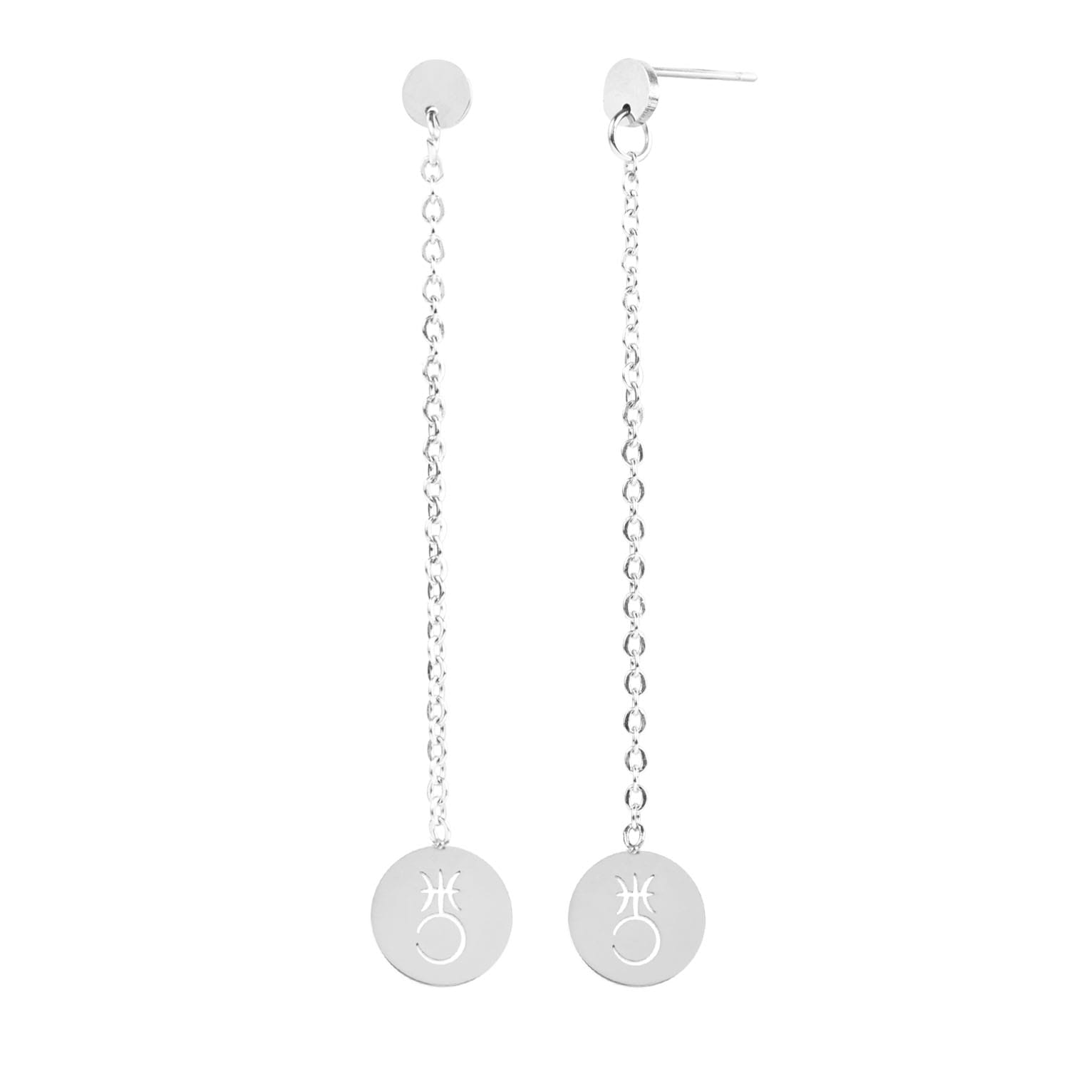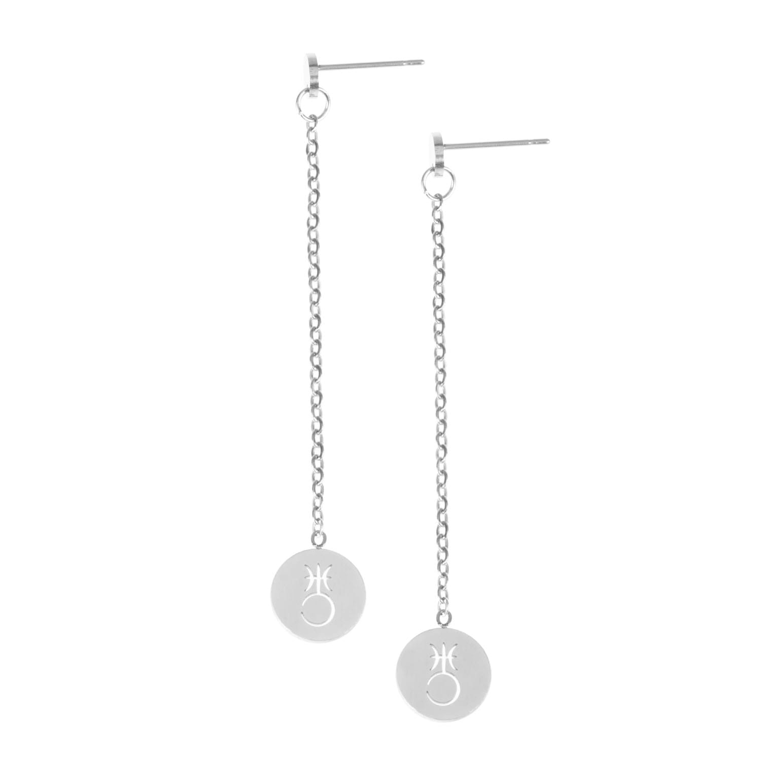 Nietuzinkowe kolczyki na łańcuszku, na którym umieszczono zawieszkę z symbolem planety. Całości dopełniają ozdobne kółeczka przy zapięciu typu sztyft. Wszystkie elementy zostały wykonane ze stali szlachetnej.