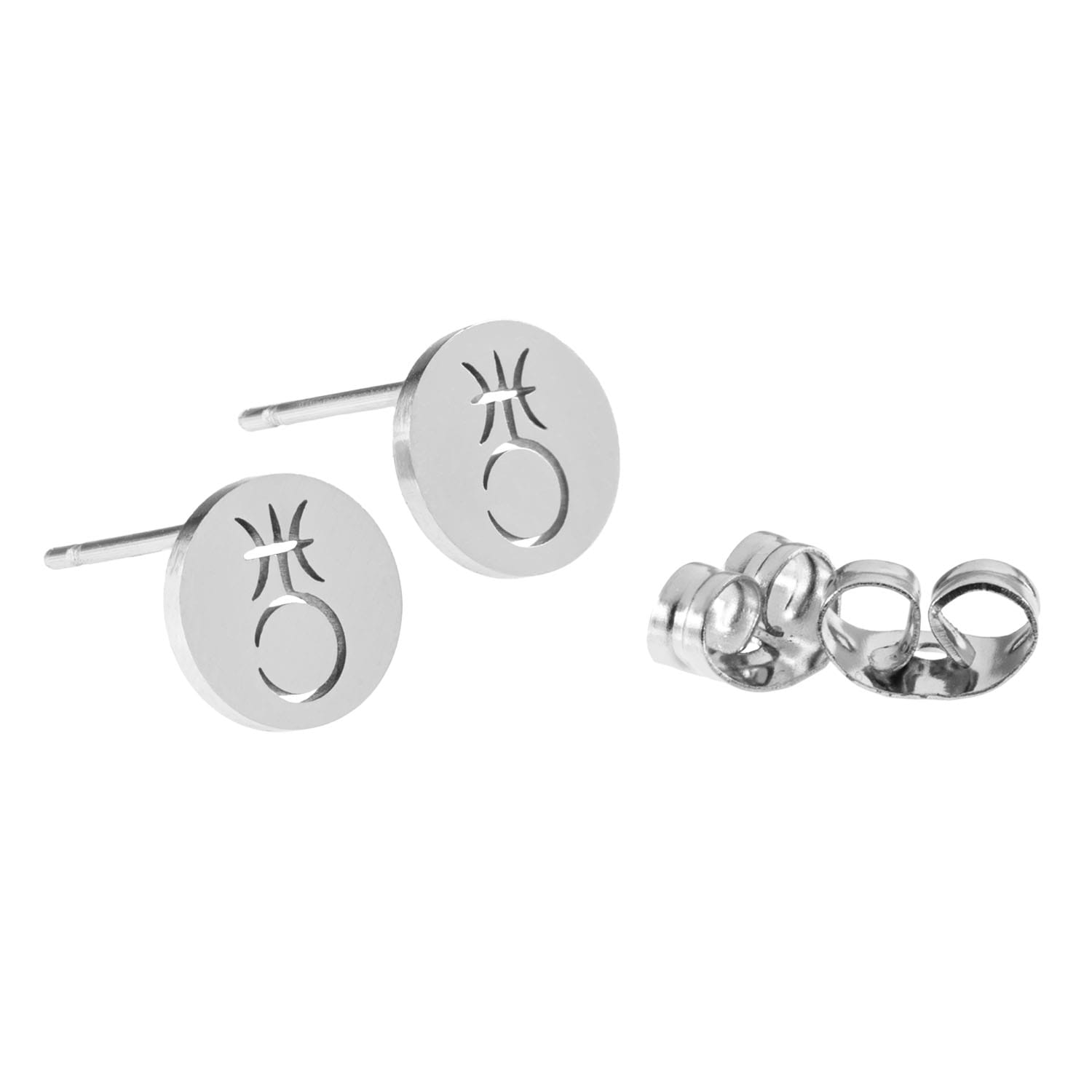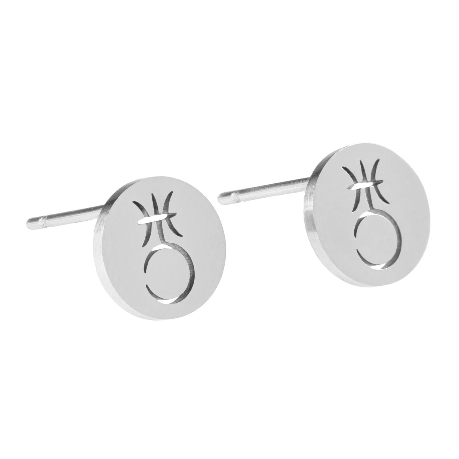Nietuzinkowe kolczyki na sztyfcie z okrągłym medalikiem z symbolem planety. Wszystkie elementy zostały wykonane ze stali szlachetnej.
