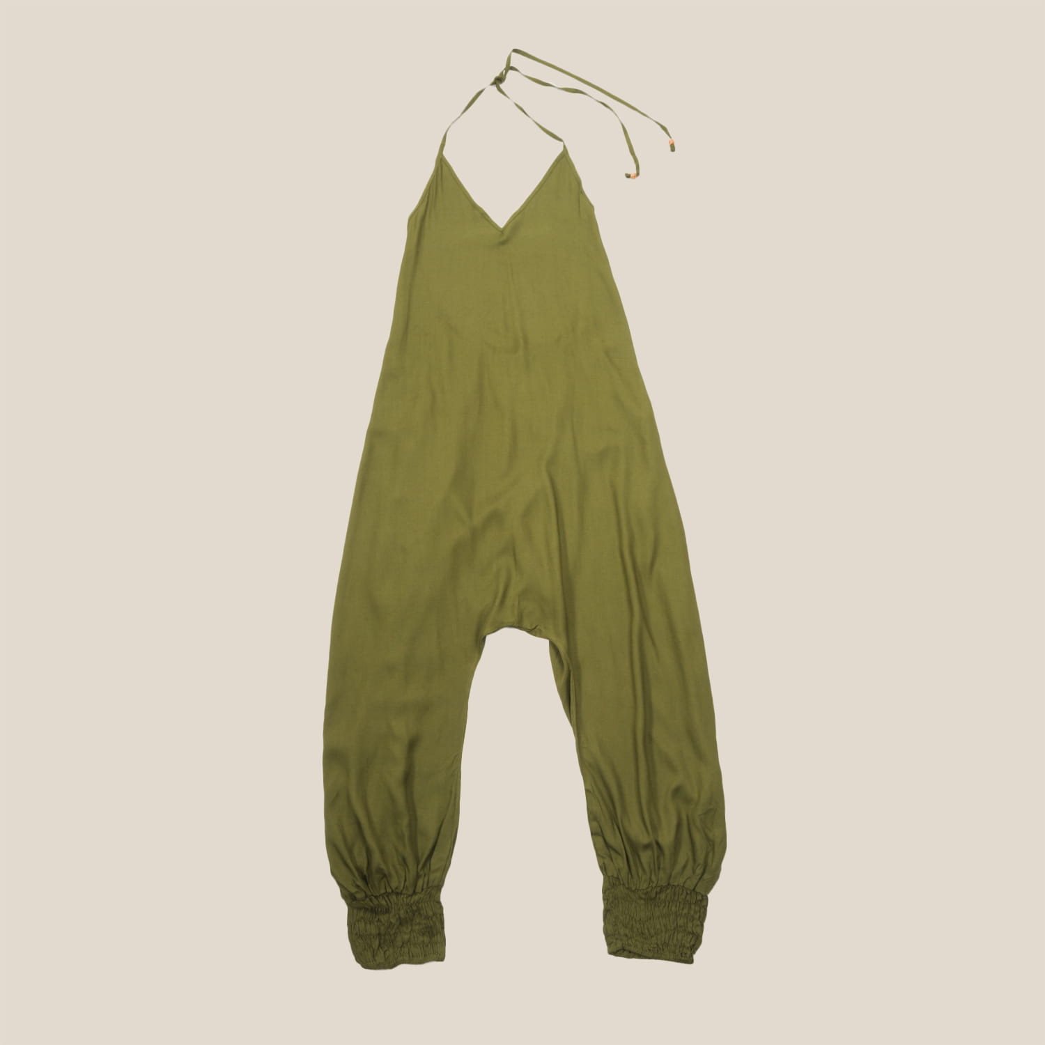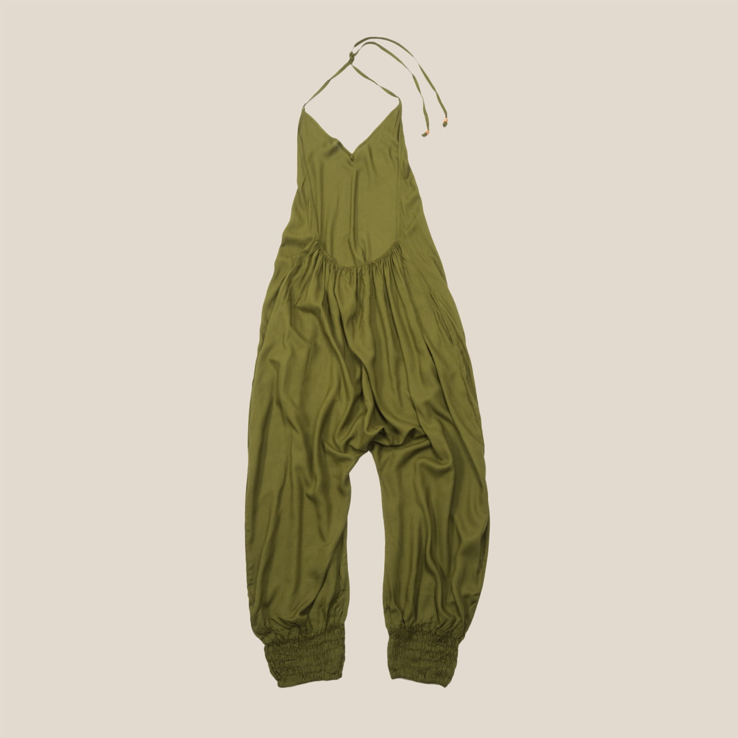 Khaki kombinezon wiązany na szyi z odkrytymi plecami.