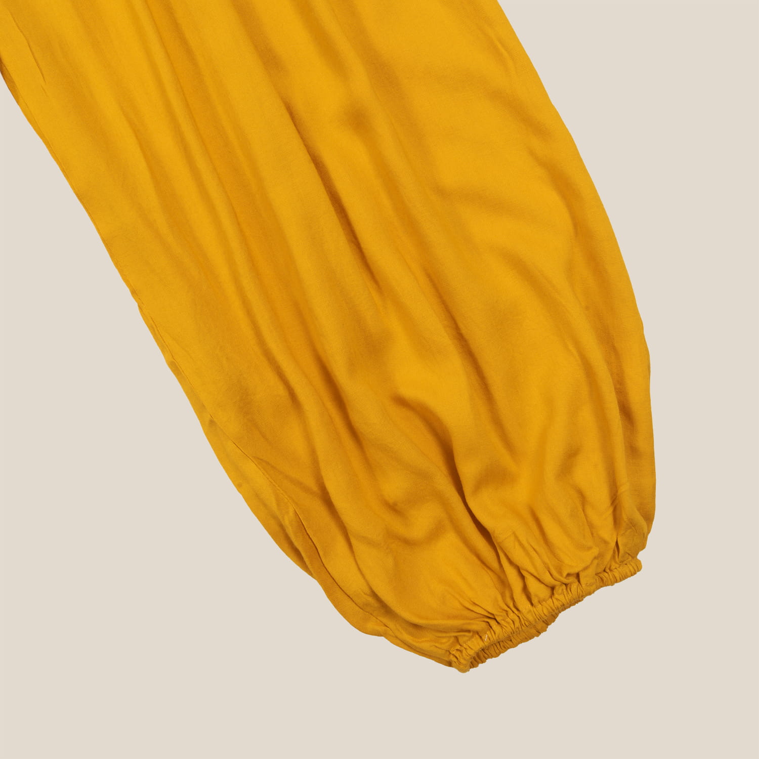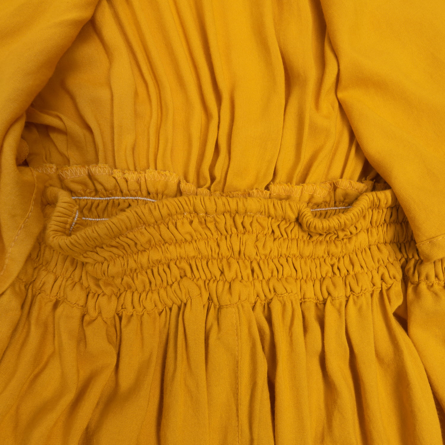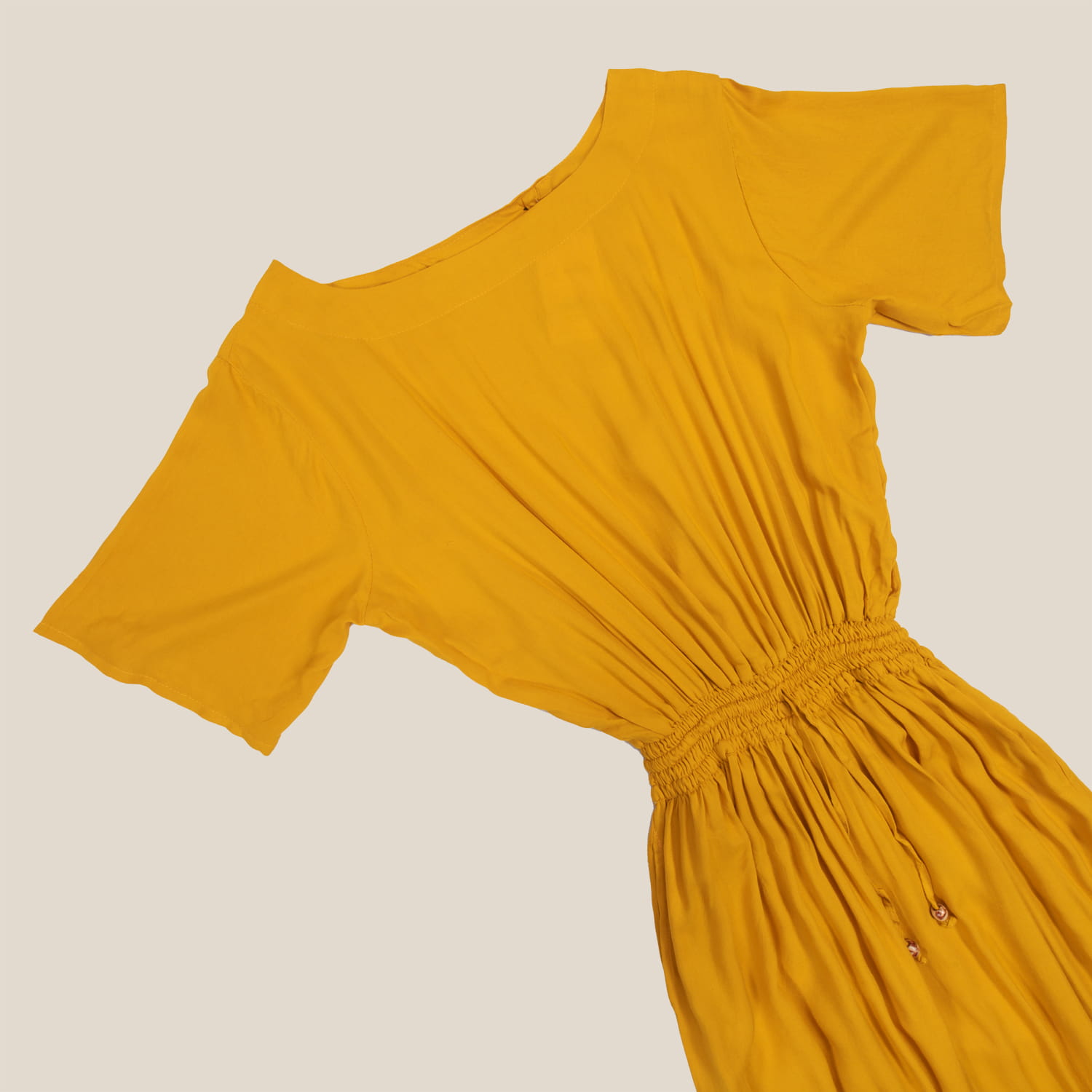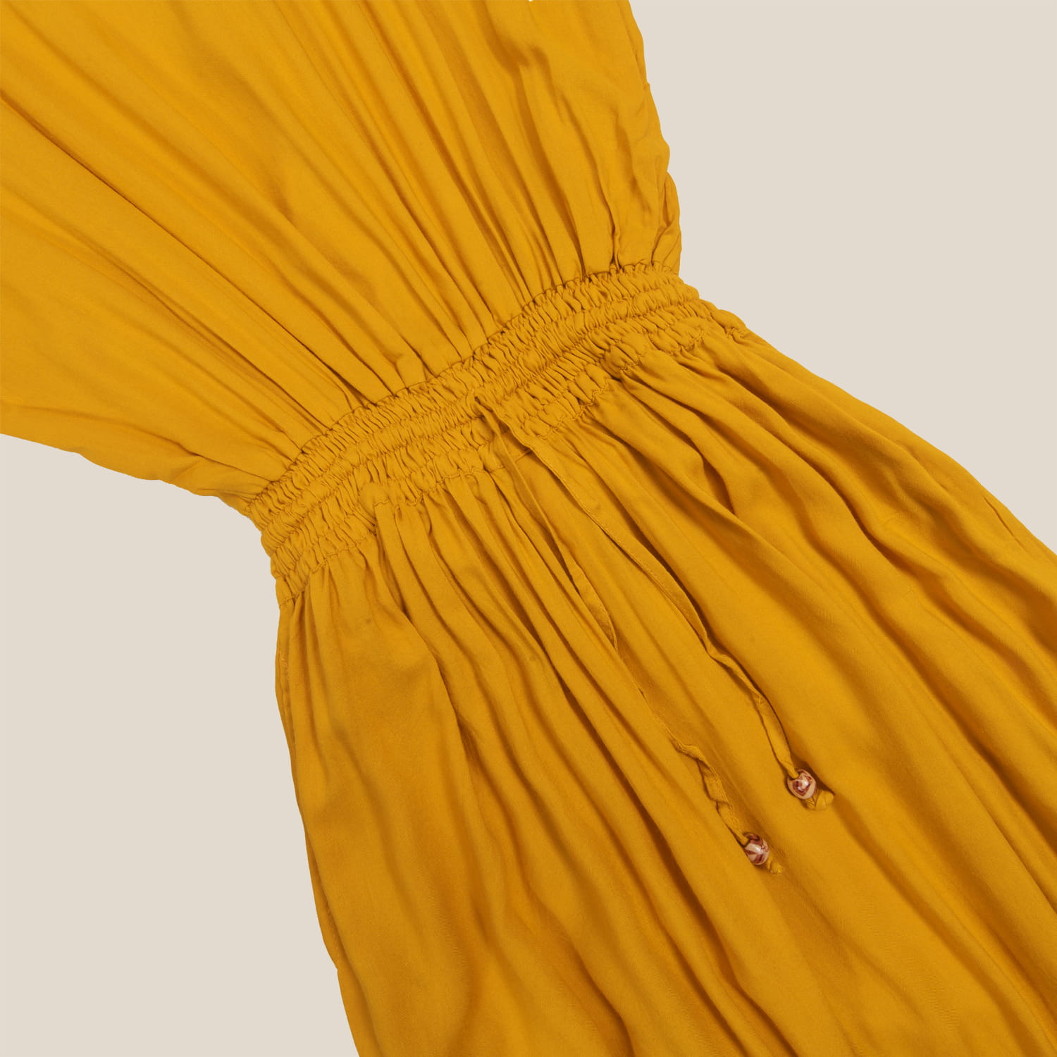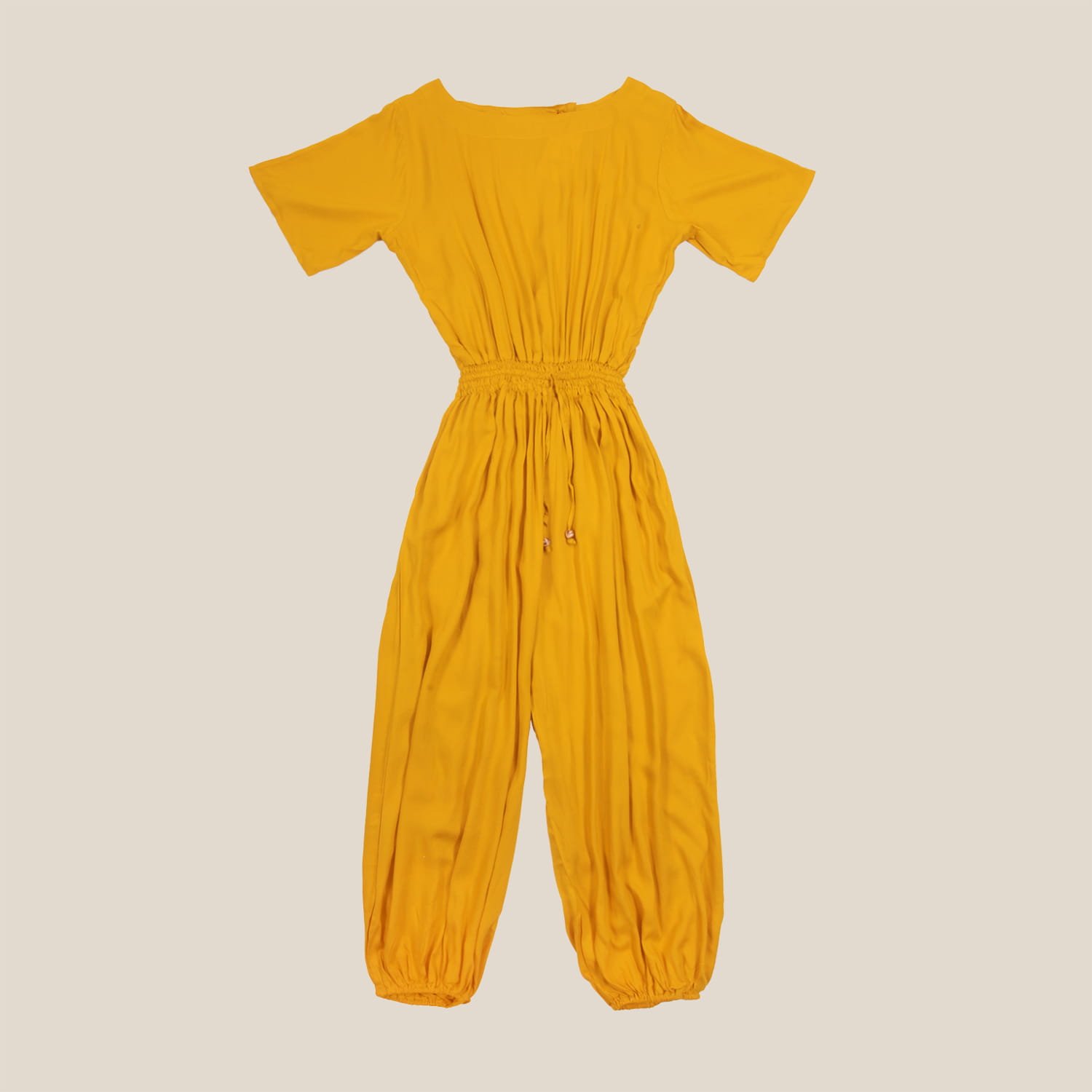 Kombinezon z odkrytymi plecami w kolorze musztardowym.