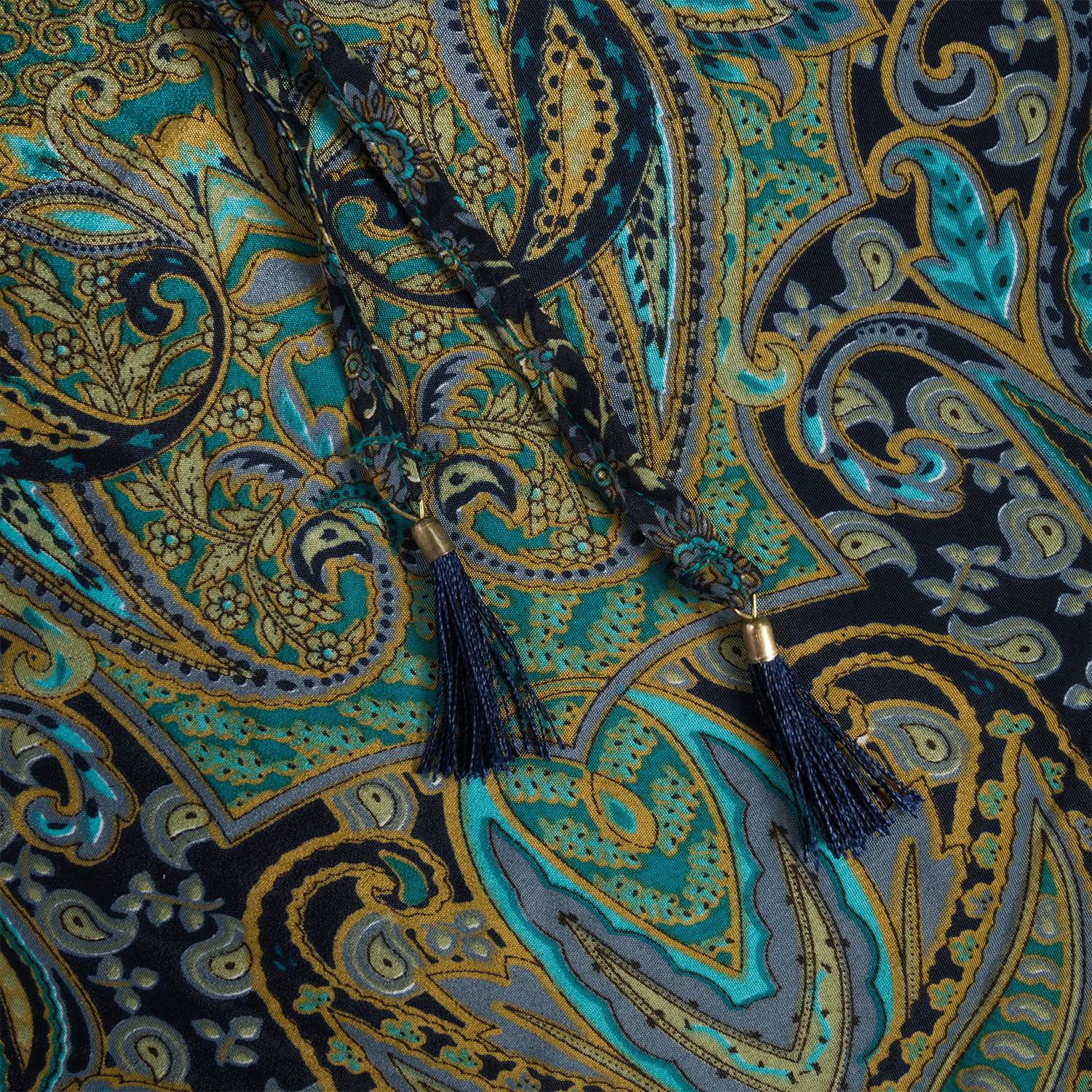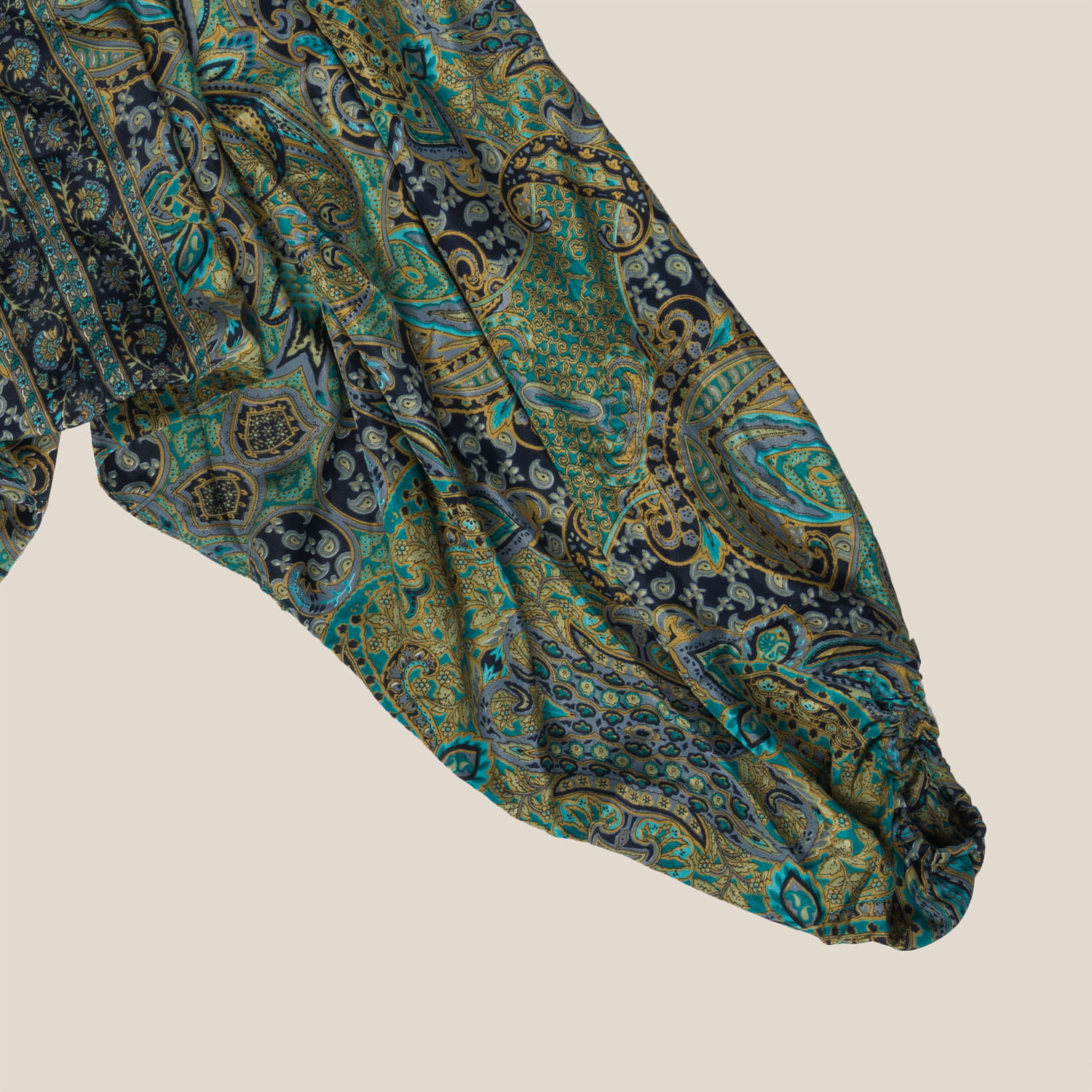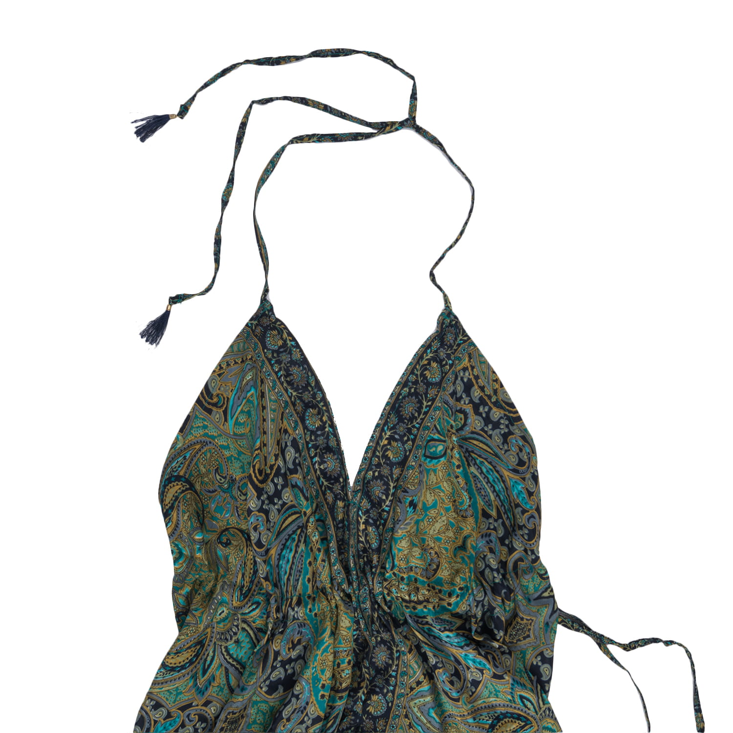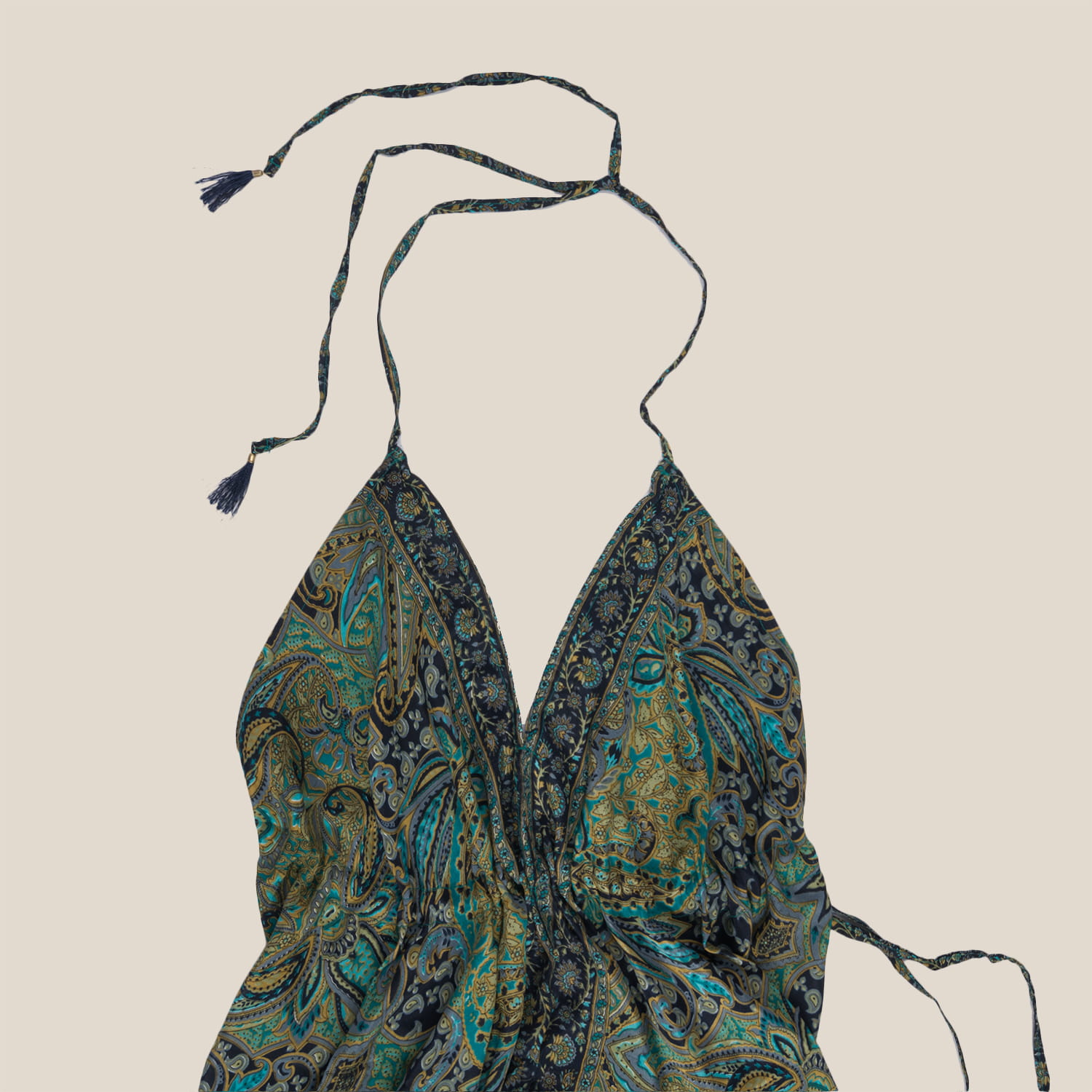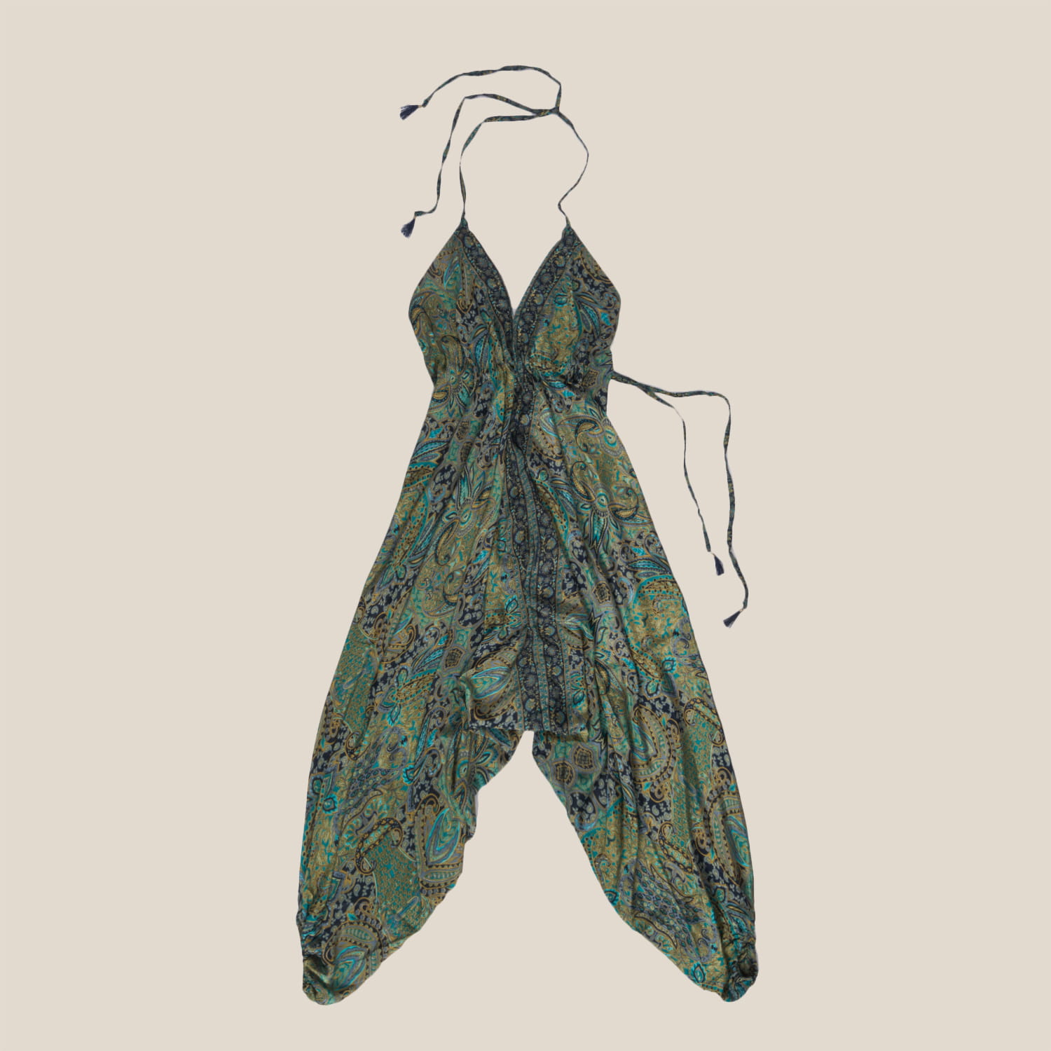 Ciemnozielony kombinezon wiązany na szyi i na plecach.