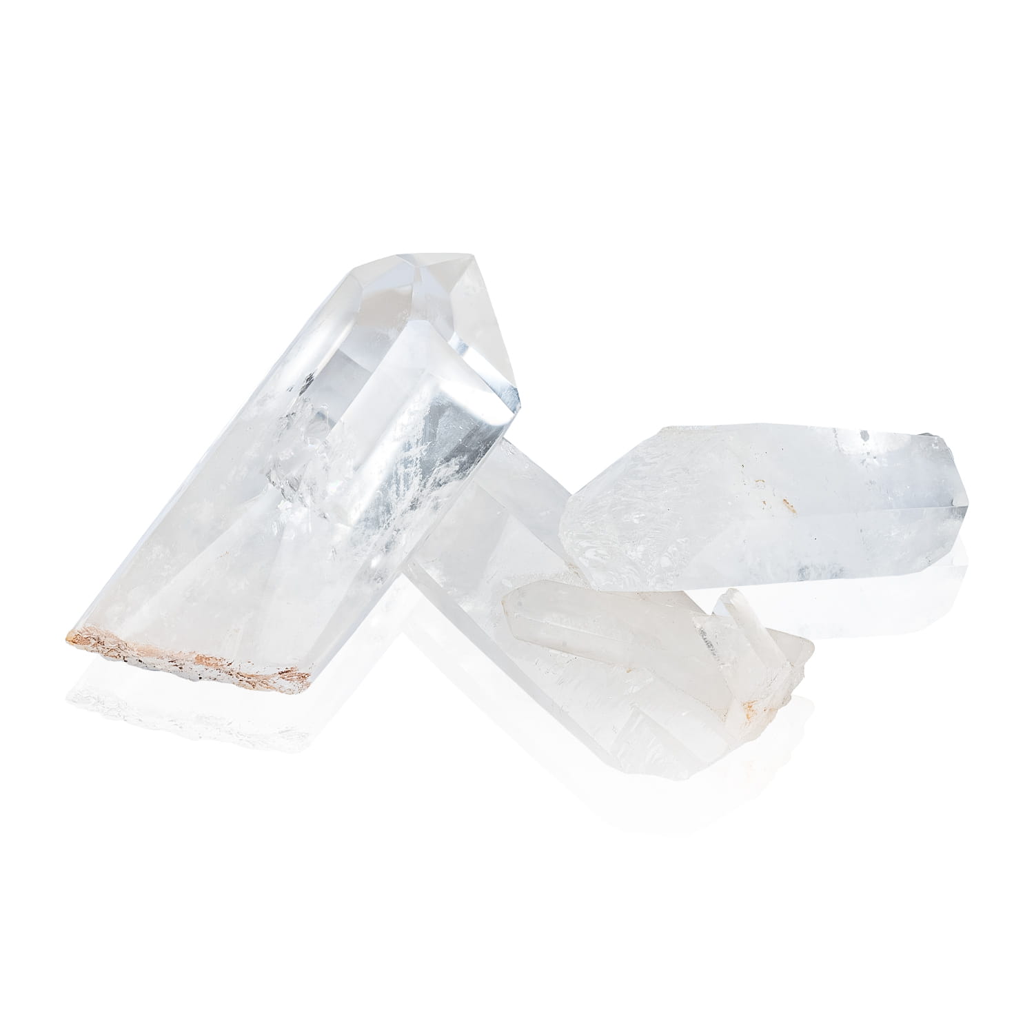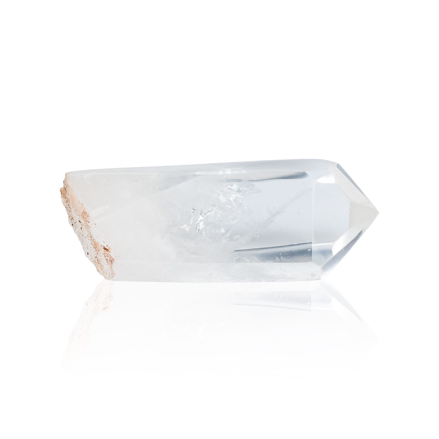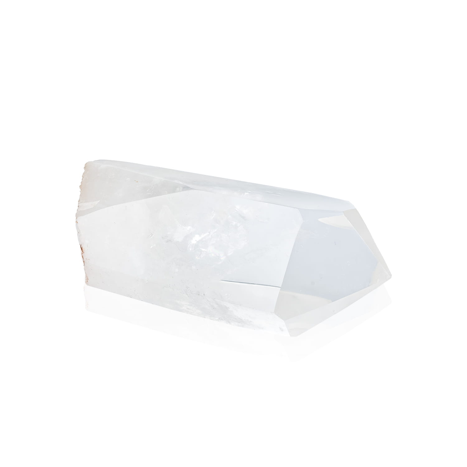 Kryształ górski w formie słupka oszlifowanego z jednej strony. Dolna strona słupka zachowana jest w naturalnej, nieoszlifowanej formie.