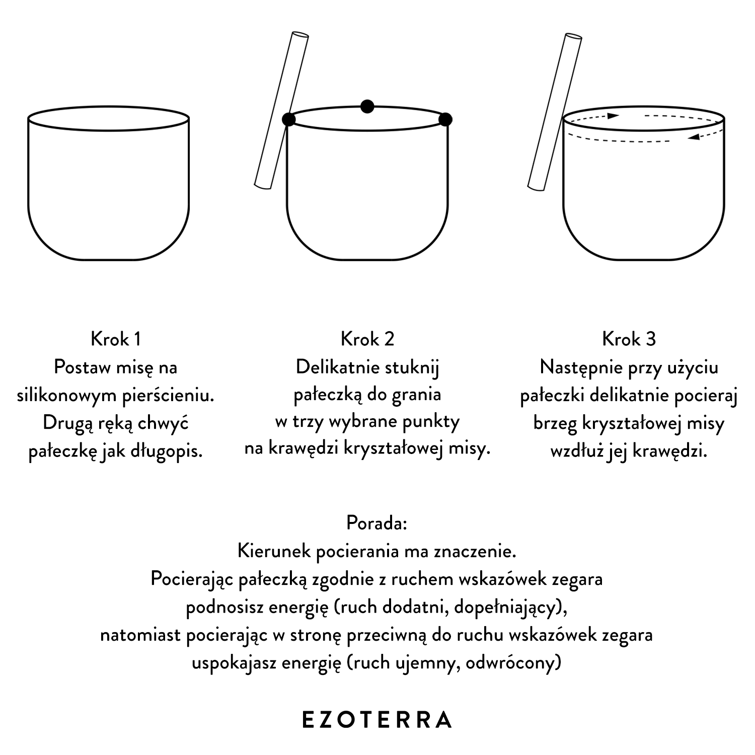 Pałeczkę można prowadzić w dowolnym kierunku, choć kierunek pocierania ma znaczenie. Pocierając pałeczką zgodnie z ruchem wskazówek zegara podnosisz energię (ruch dodatni, dopełniający), natomiast pocierając w stronę przeciwną do ruchu wskazówek zegara uspokajasz energię (ruch ujemny, odwrócony). Gdy przestaniesz prowadzić pałeczkę po obręczy misy, dźwięk zacznie się wyciszać.