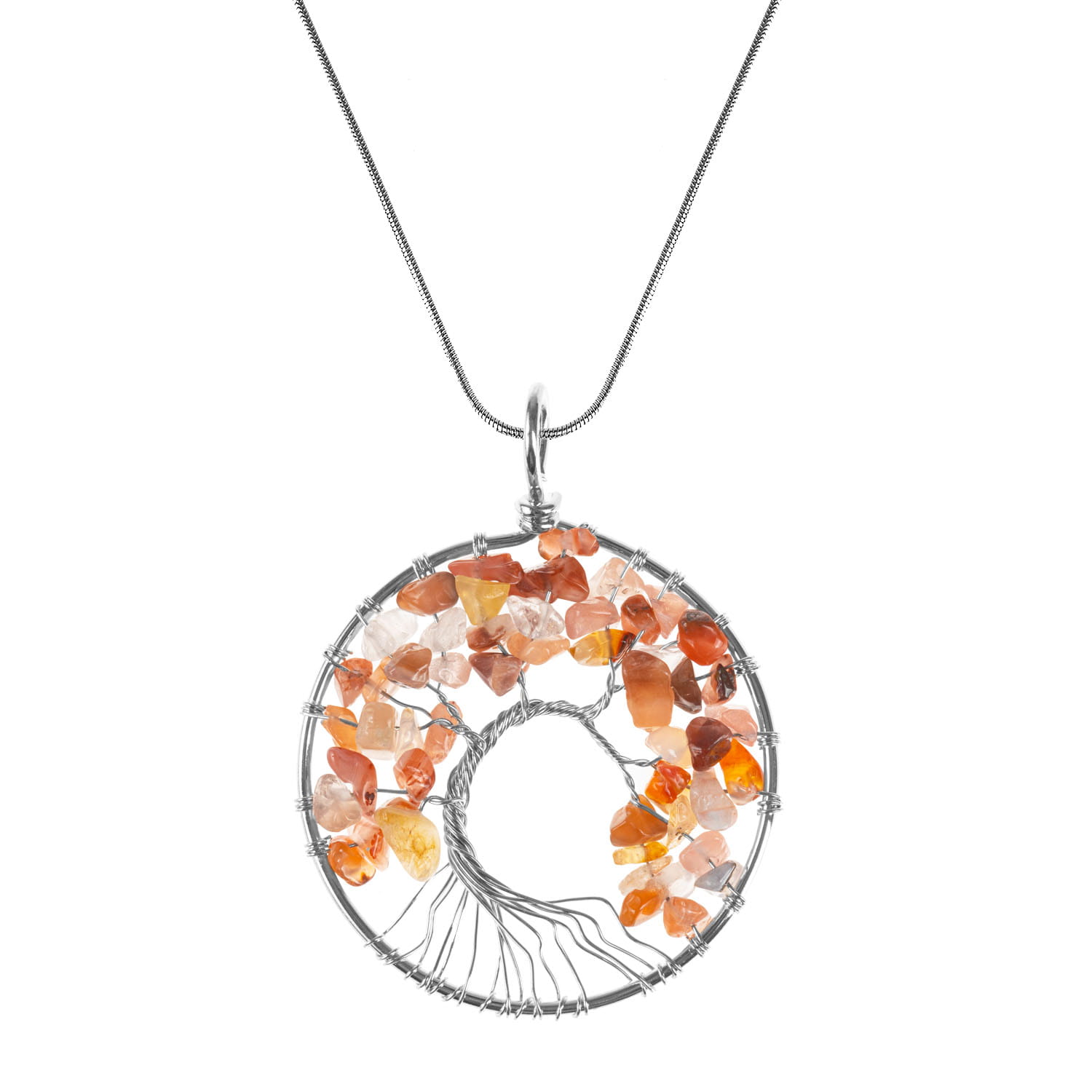 Okrągły naszyjnik z ręcznie plecionym Drzewem Życia wykonany ze stali szlachetnej i kamieni naturalnych na łańcuszku o regulowanej długości.