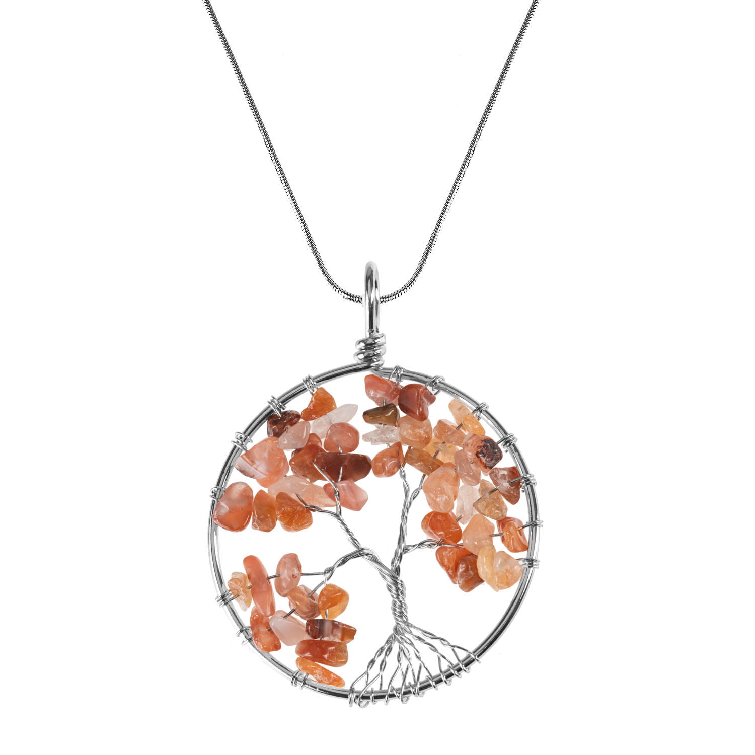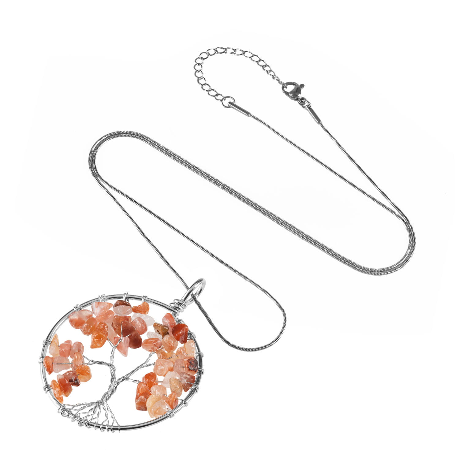 Okrągły naszyjnik z ręcznie plecionym Drzewem Życia wykonany ze stali szlachetnej i kamieni naturalnych na łańcuszku o regulowanej długości.