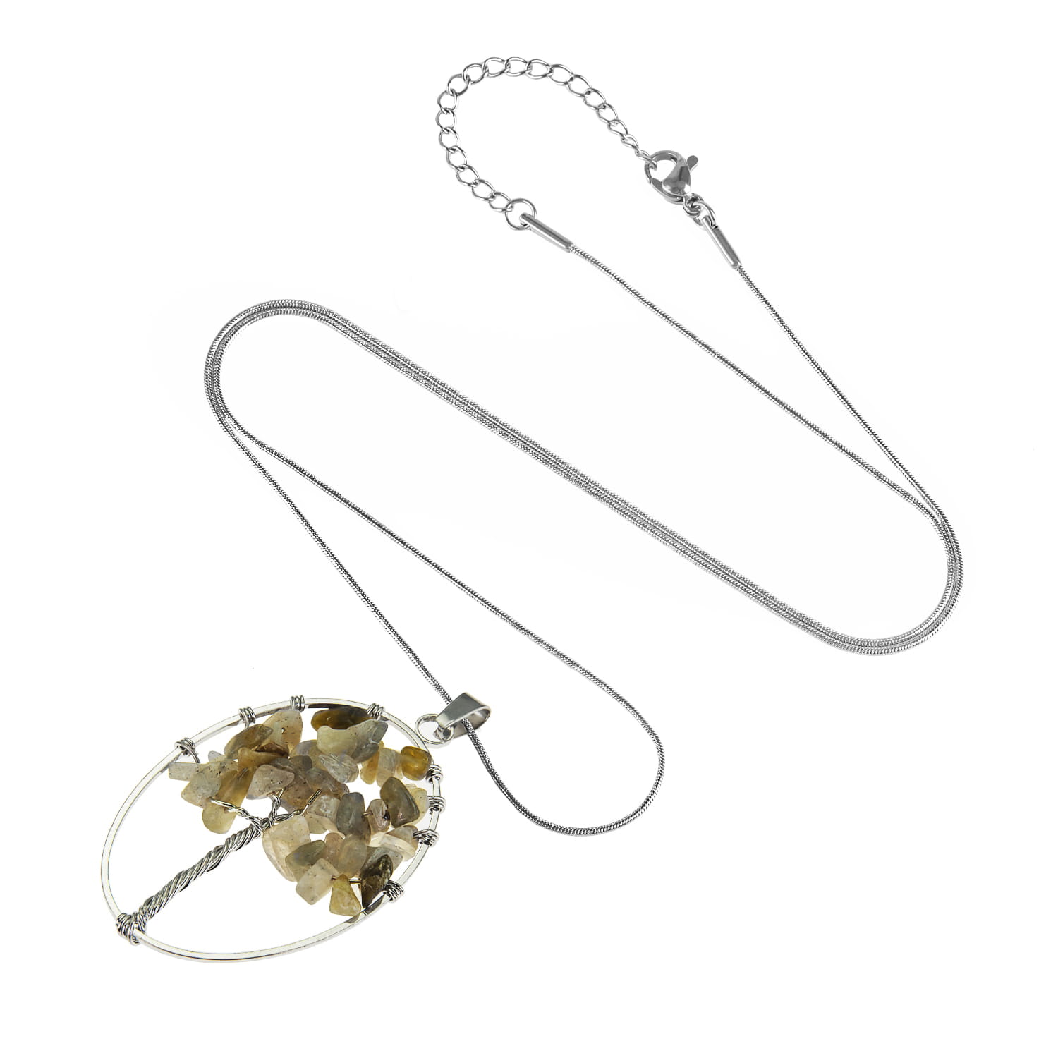 Owalny naszyjnik z ręcznie plecionym Drzewem Życia wykonany ze stali szlachetnej i kamieni naturalnych na łańcuszku o regulowanej długości.