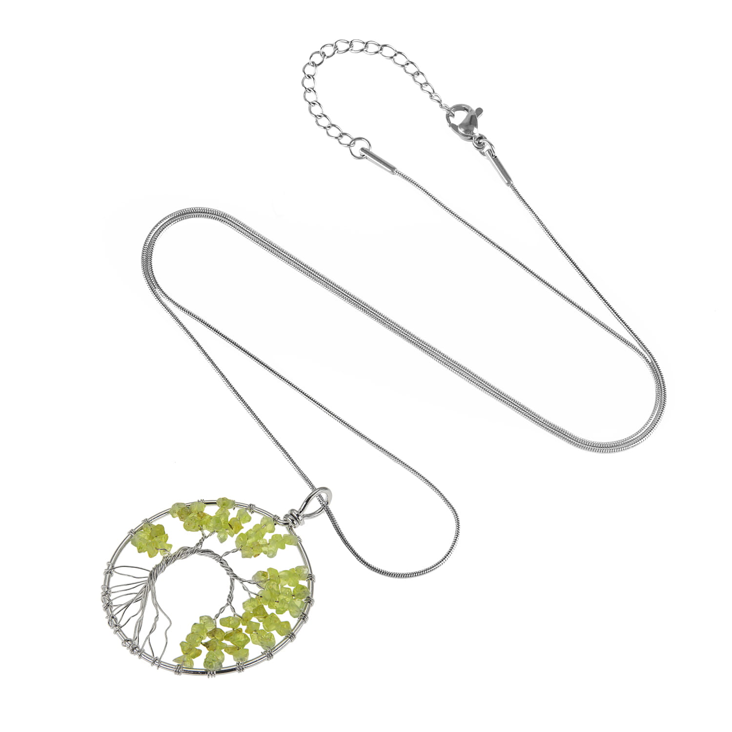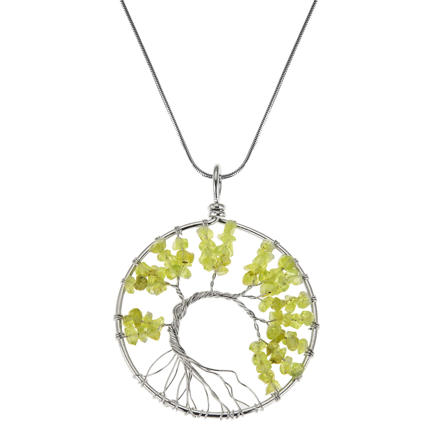 Okrągły naszyjnik z ręcznie plecionym Drzewem Życia wykonany ze stali szlachetnej i kamieni naturalnych na łańcuszku o regulowanej długości.