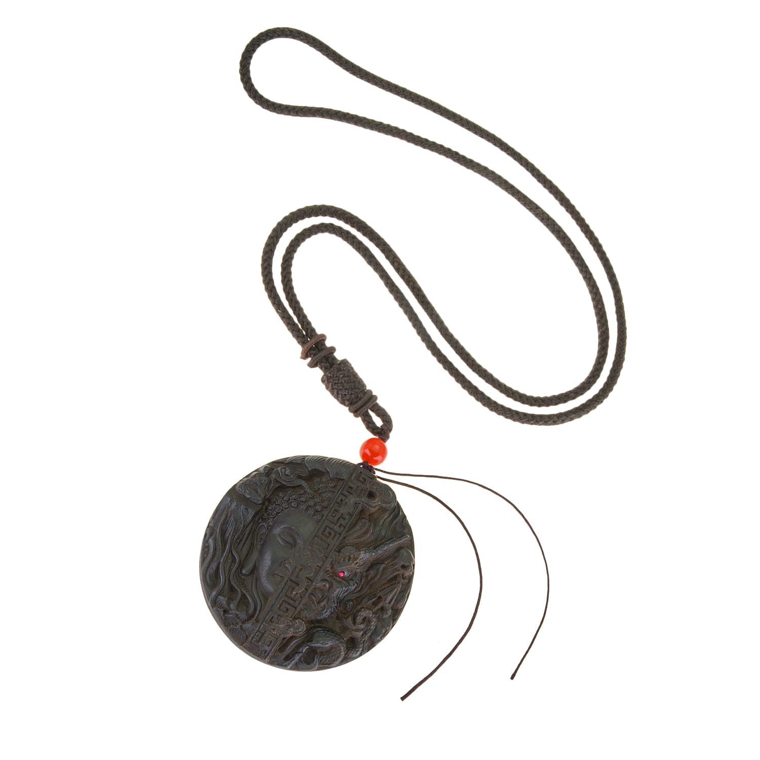 Rzeźbiony w drewnie medalion na brązowym sznurku.