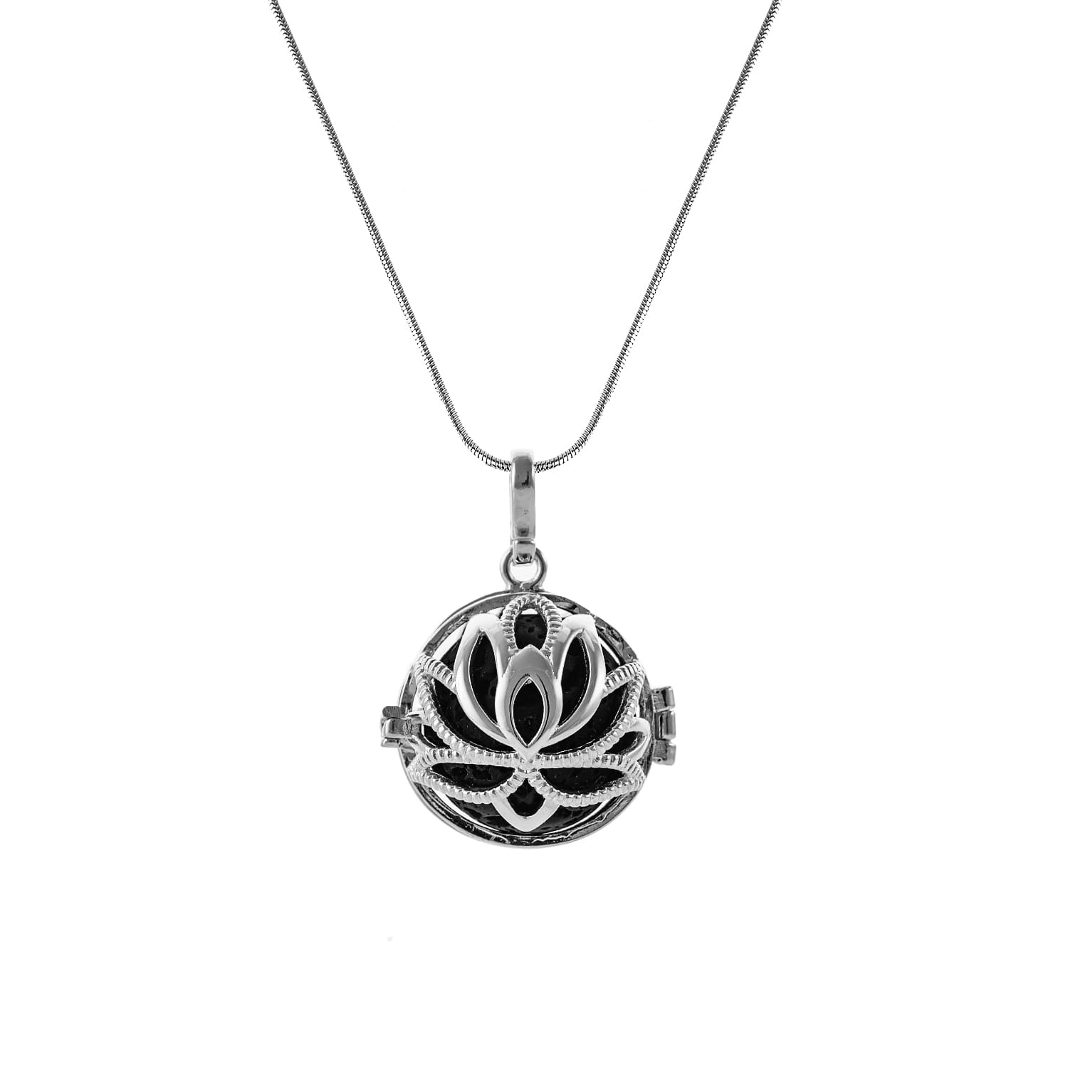 Naszyjnik do aromaterapii składa się z regulowanego łańcuszka oraz zawieszki w kształcie Kwiatu Lotosu, w którym umieszczona jest kulka z lawy wulkanicznej.