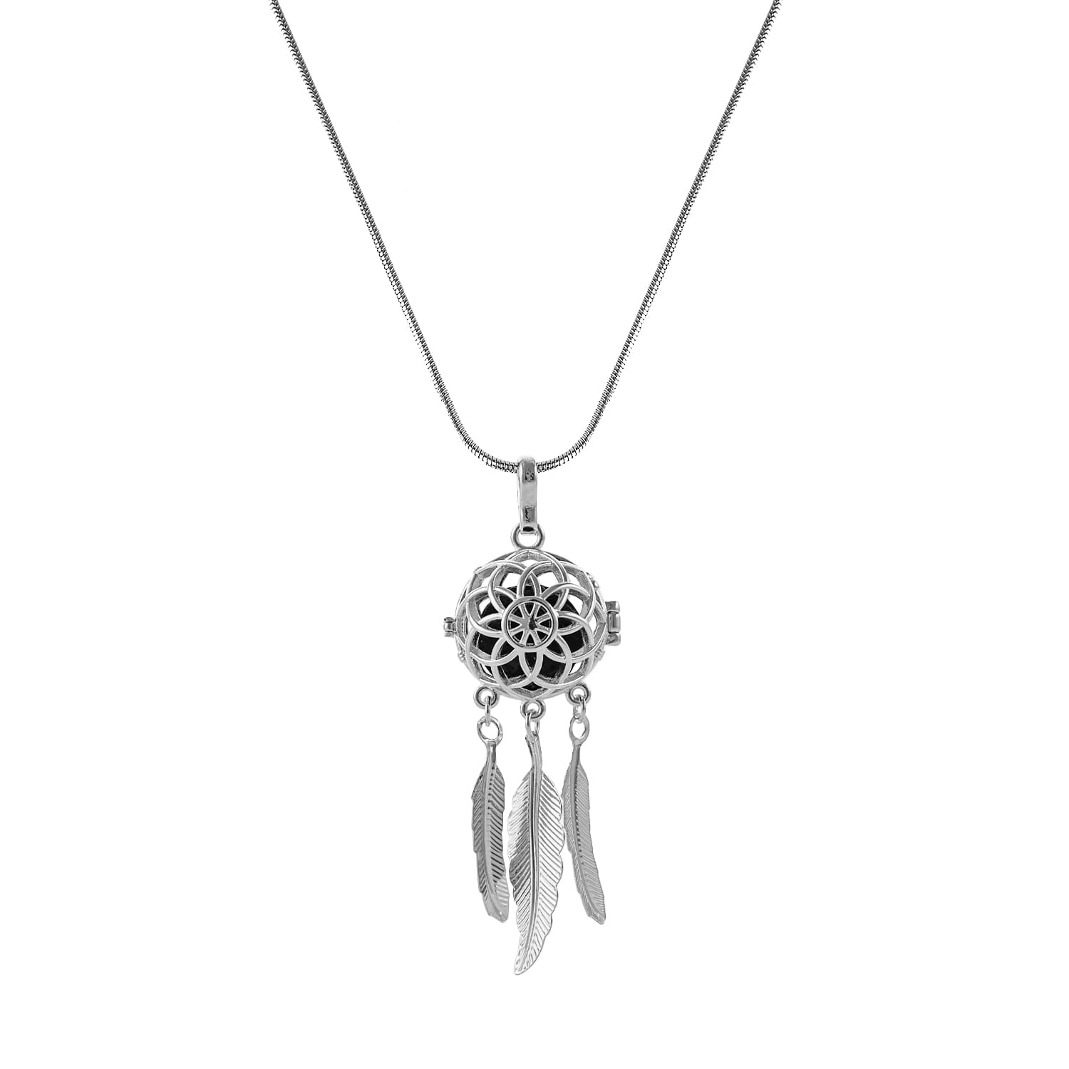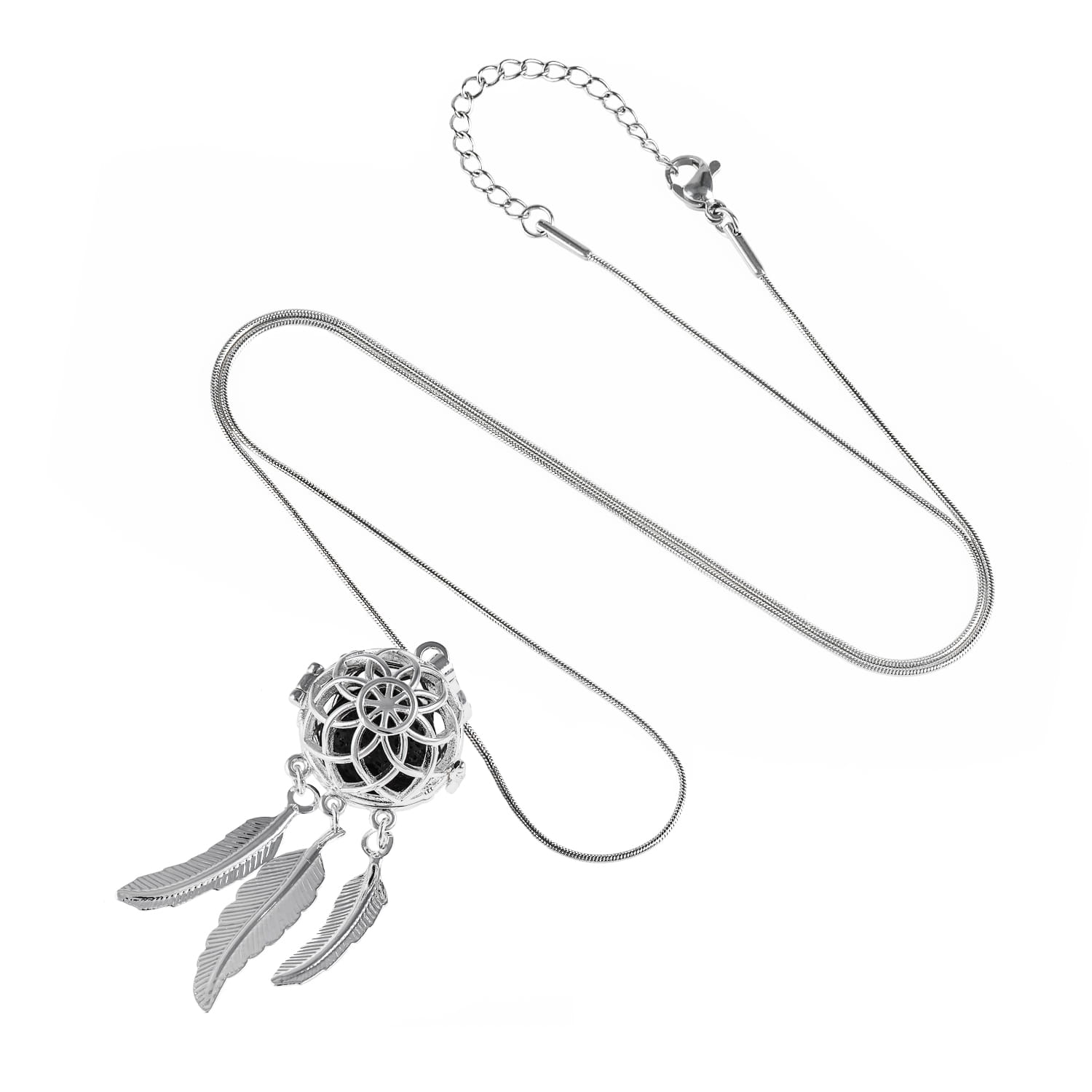 Naszyjnik do aromaterapii składa się z regulowanego łańcuszka oraz zawieszki w kształcie Łapacza Snów, w którym umieszczona jest kulka z lawy wulkanicznej.