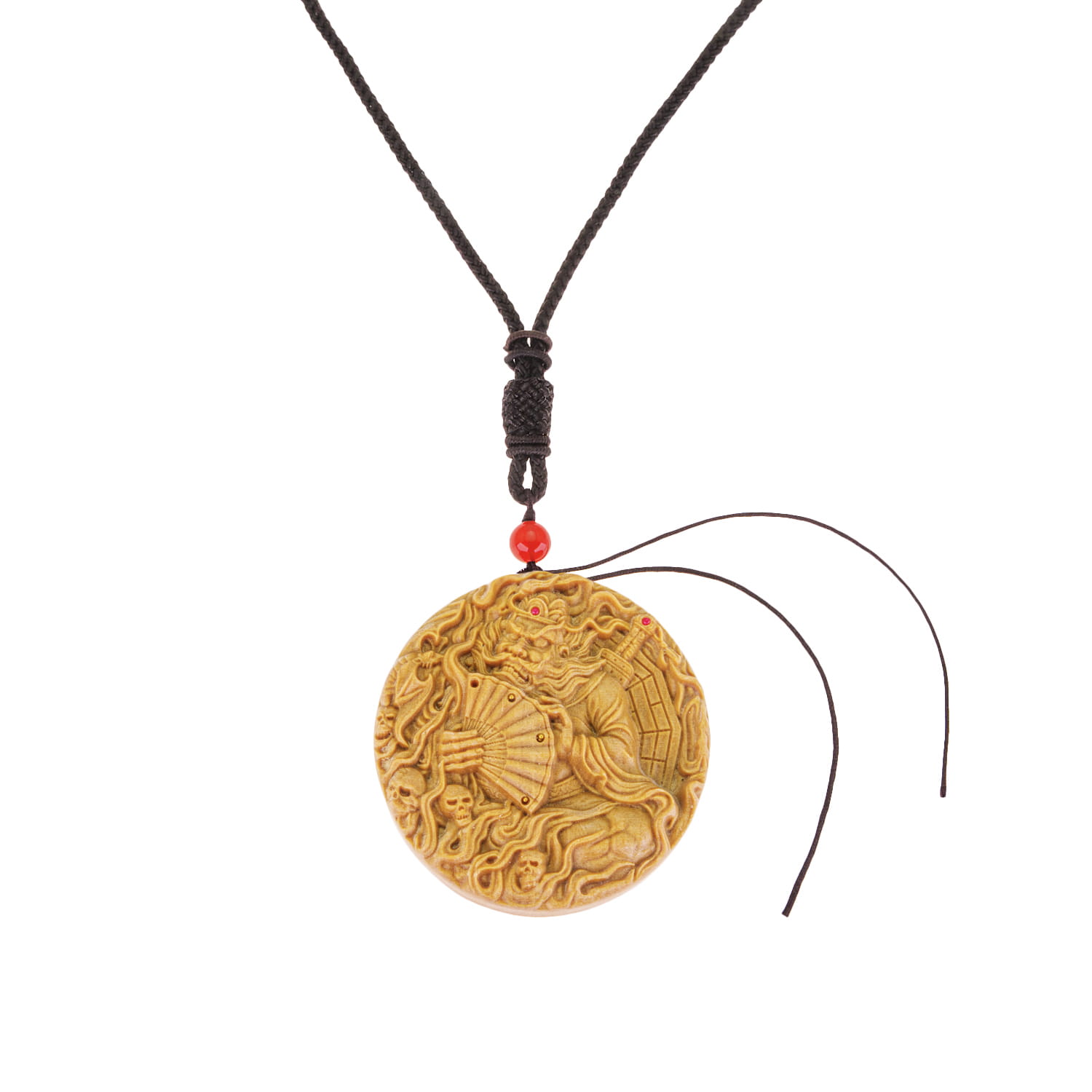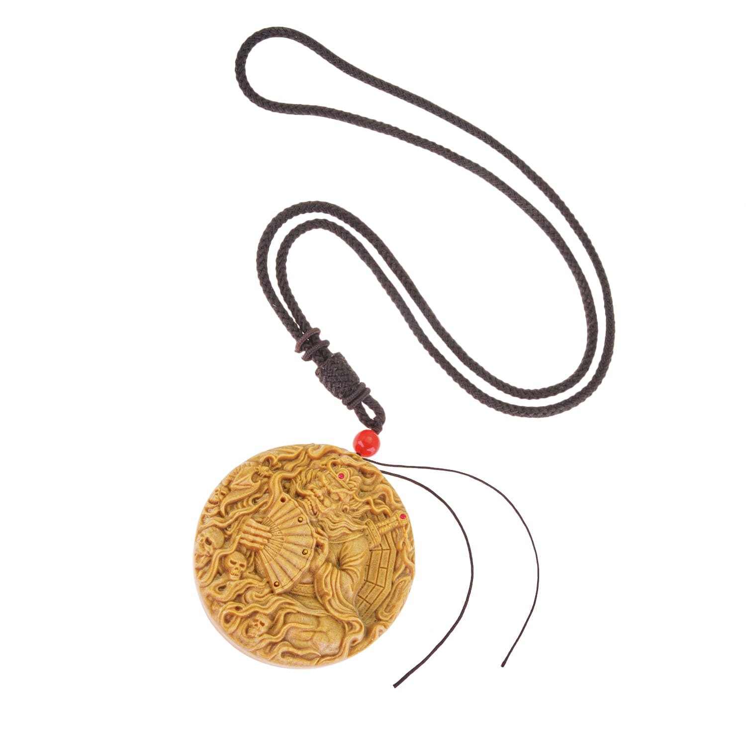 Rzeźbiony w drewnie medalion na brązowym sznurku.