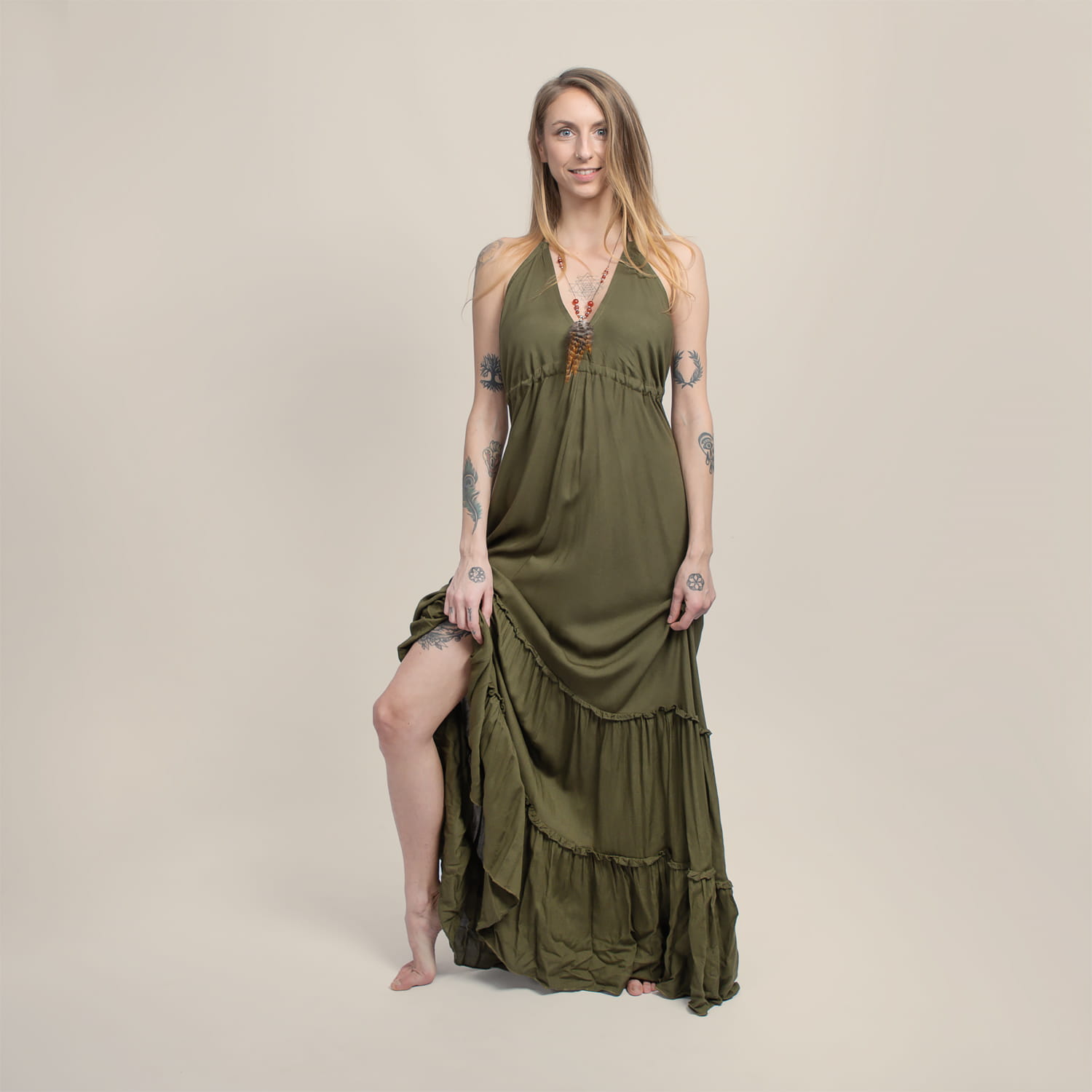 Długa sukienka w kolorze khaki wiązana na szyi i na plecach.