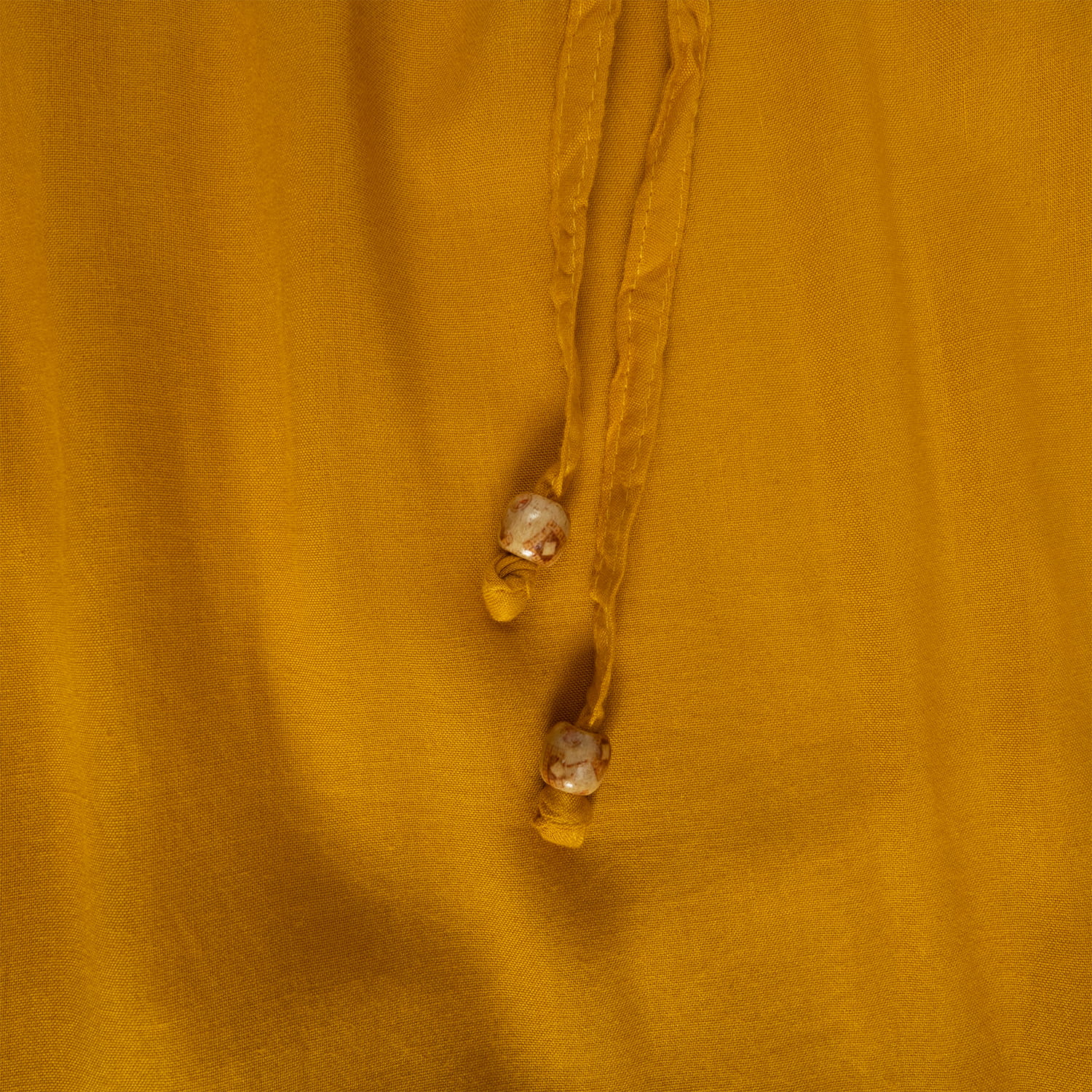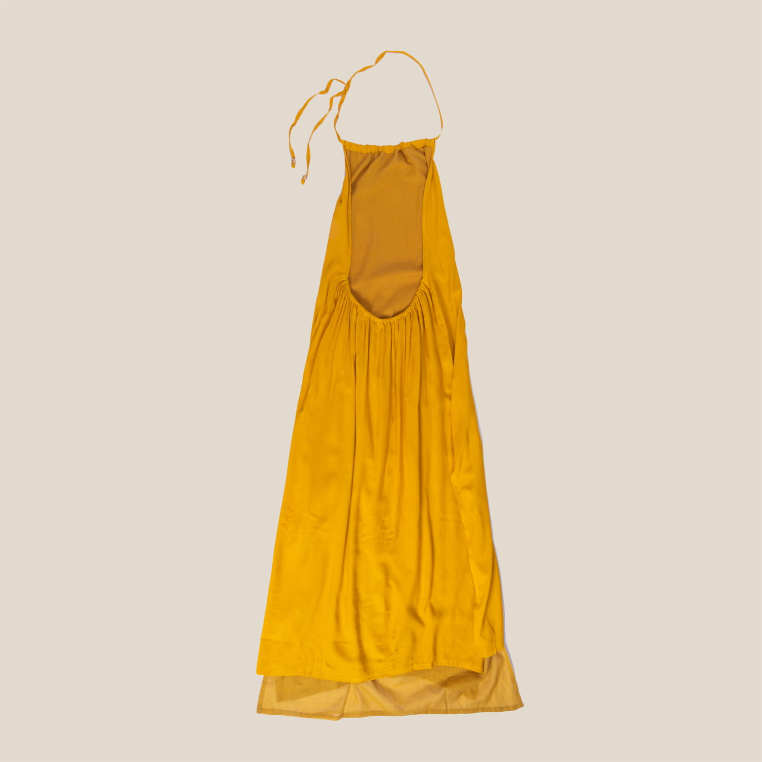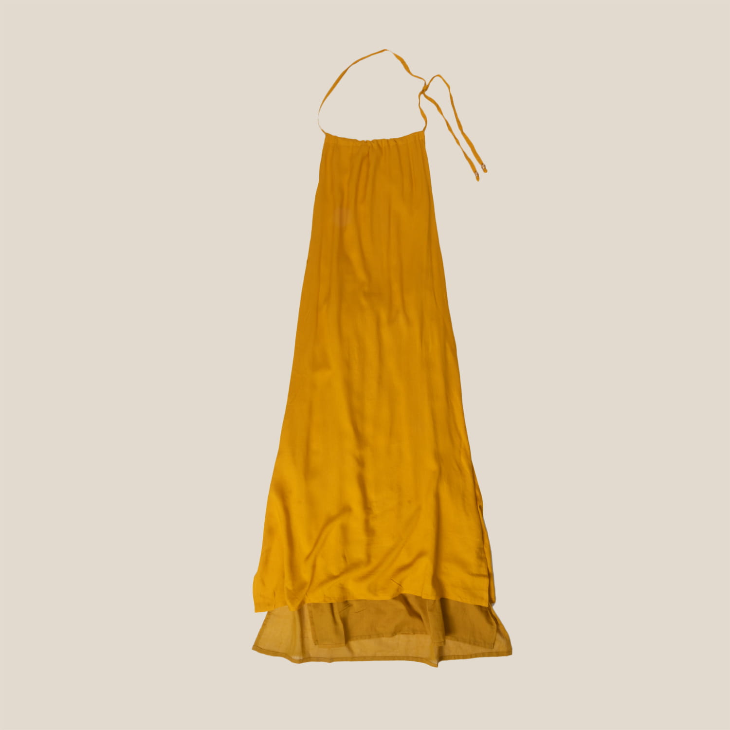 Długa musztardowa sukienka wiązana na szyi.